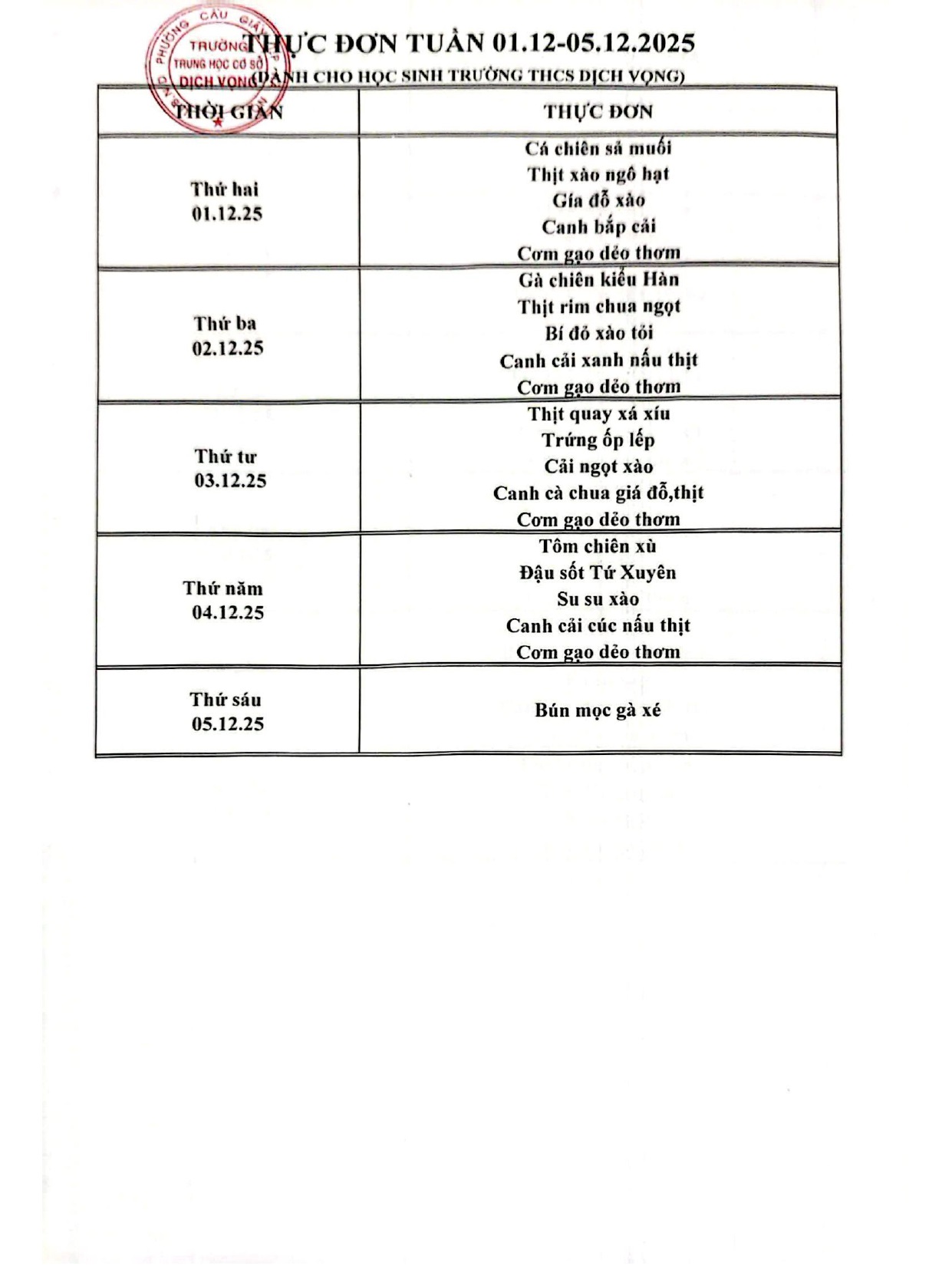 Trường THCS Dịch Vọng công khai thực đơn bán trú học sinh tuần 01/12 - 05/12/2025 như sau: