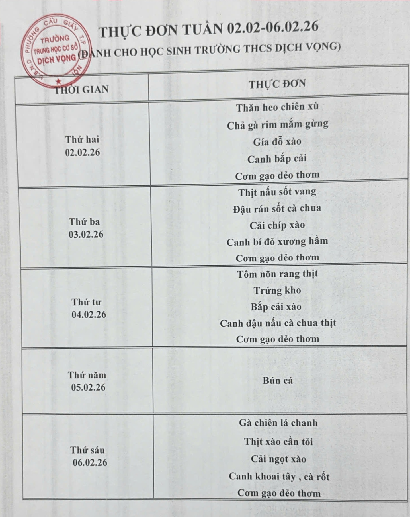 Trường THCS Dịch Vọng công khai thực đơn bán trú học sinh tuần 02/02/2026 - 06/02/2026 như sau: