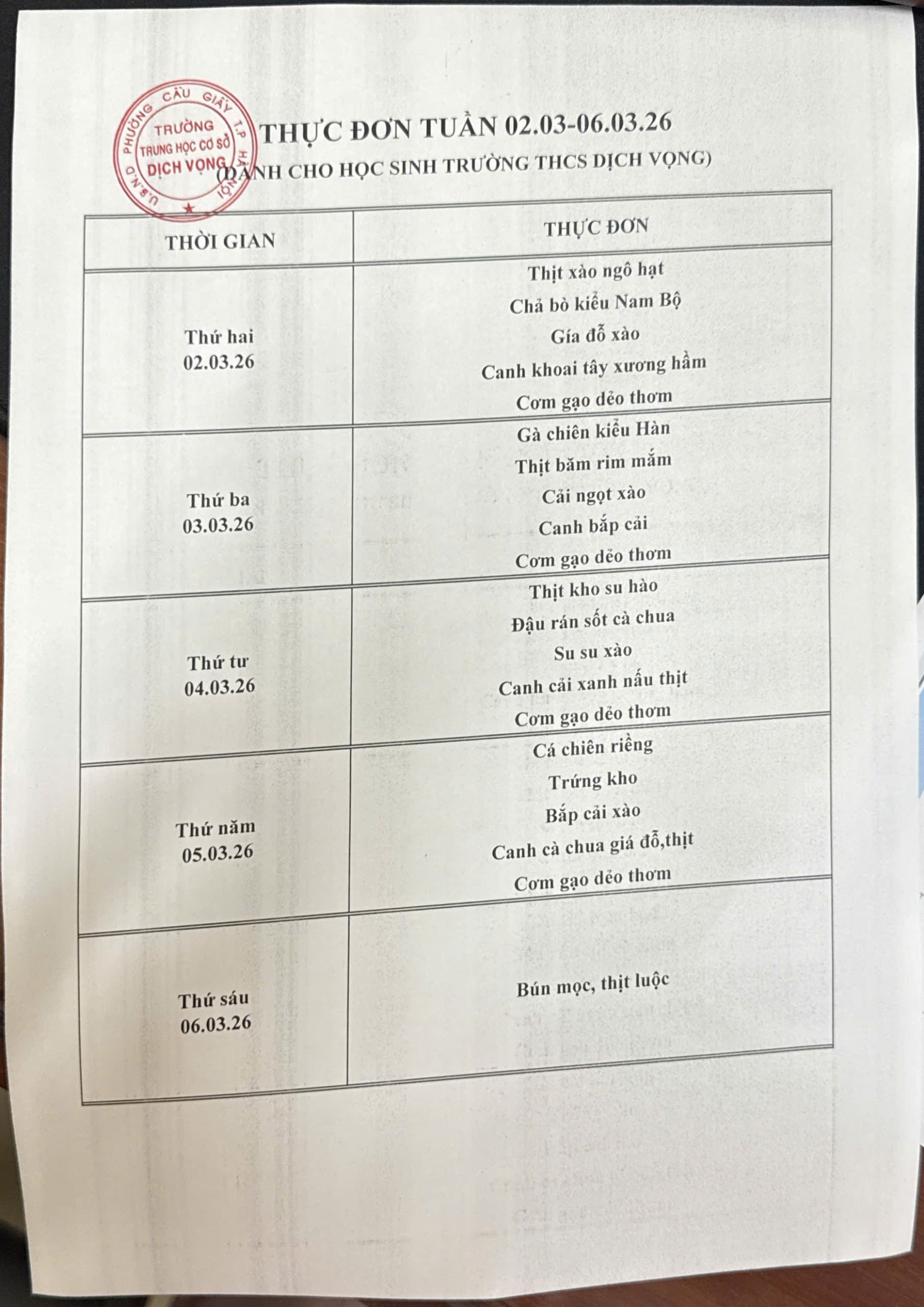 Trường THCS Dịch Vọng công khai thực đơn bán trú học sinh tuần 02/03/2026 - 06/03/2026 như sau: