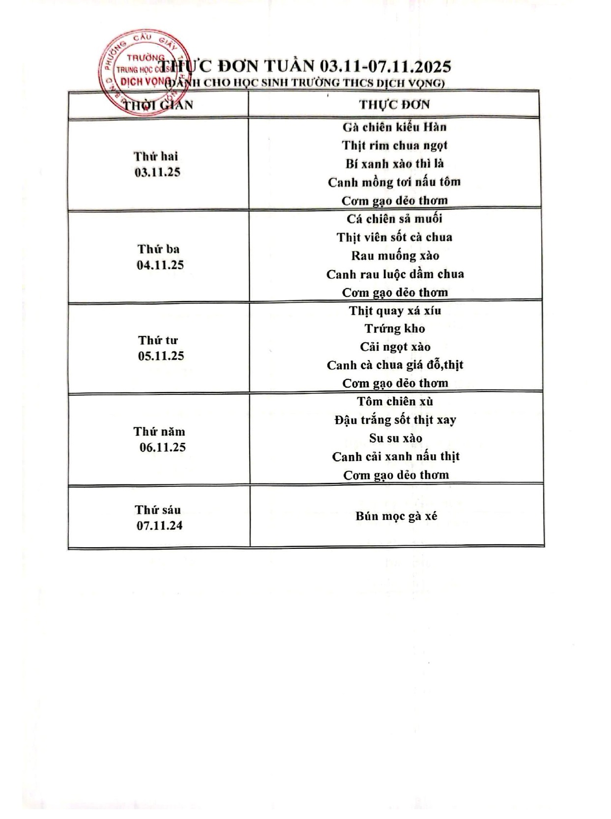 Trường THCS Dịch Vọng công khai thực đơn bán trú học sinh tuần 20/10 - 24/10/2025 như sau: