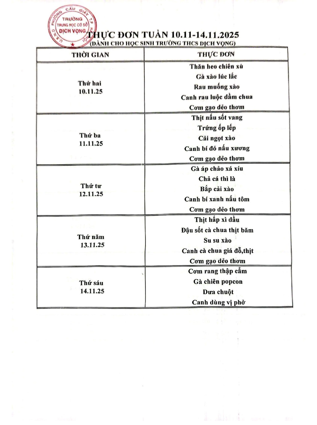 Trường THCS Dịch Vọng công khai thực đơn bán trú học sinh tuần 10/11 - 14/11/2025 như sau: