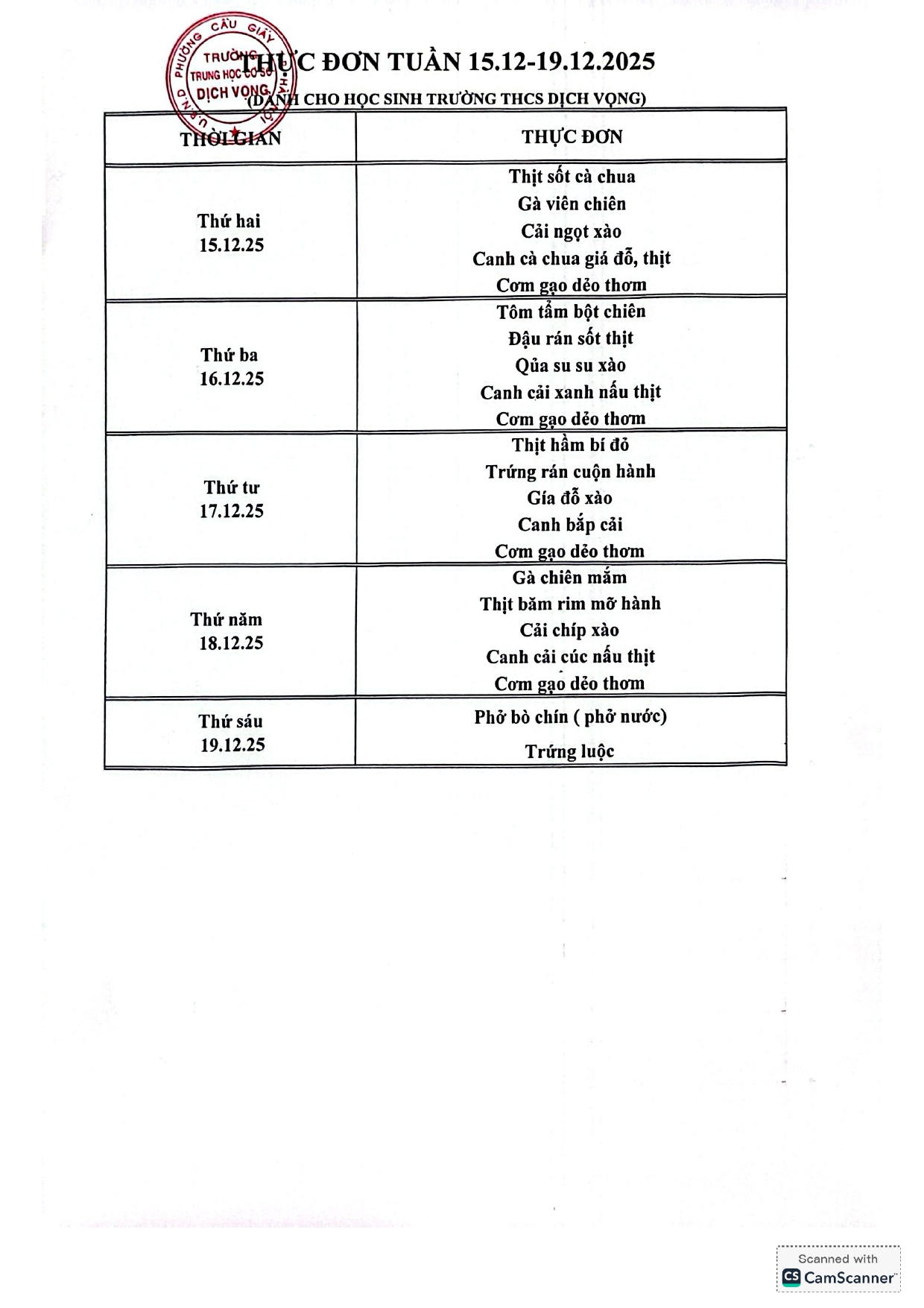 Trường THCS Dịch Vọng công khai thực đơn bán trú học sinh tuần 15/12 - 19/12/2025 như sau: