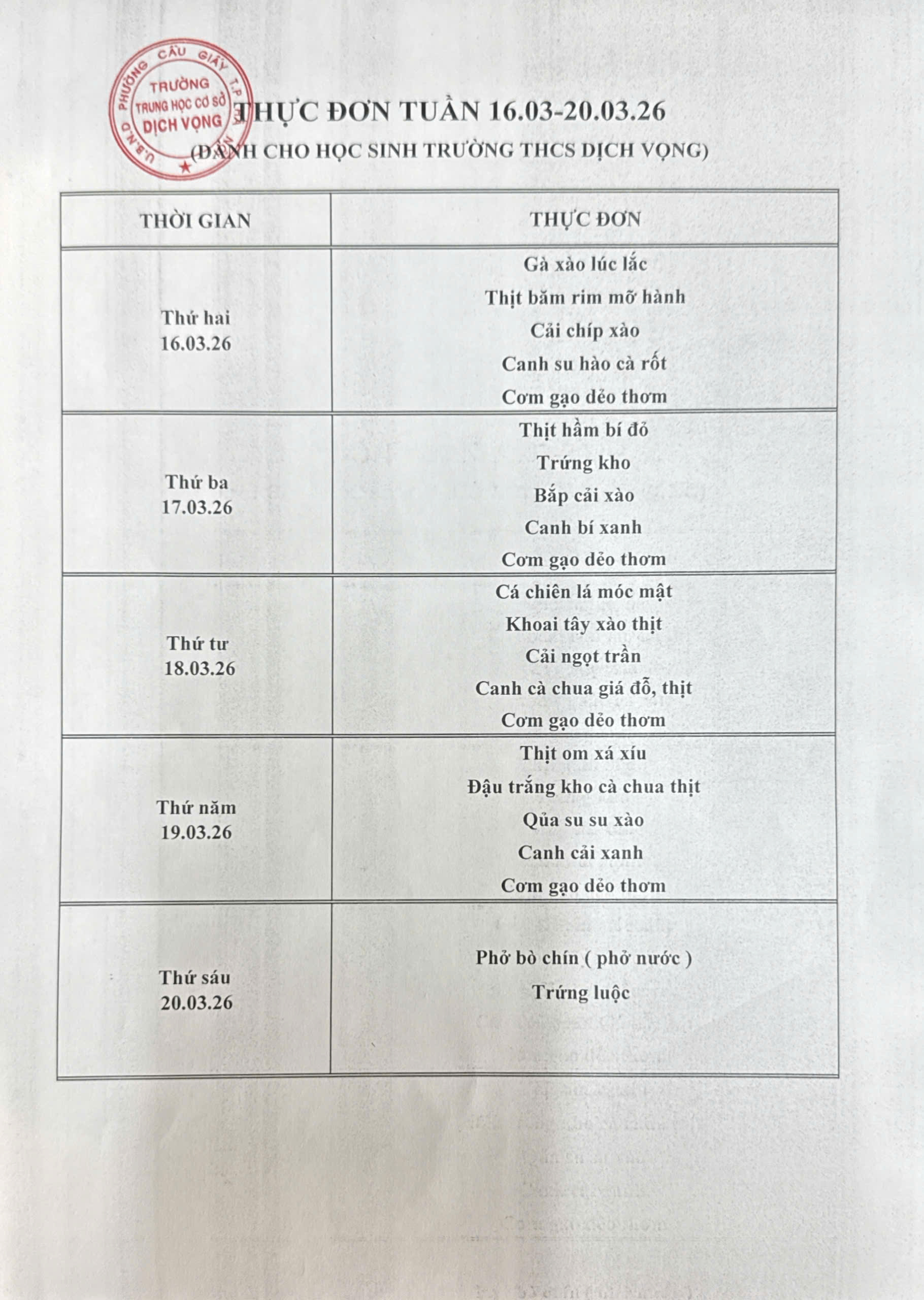 Trường THCS Dịch Vọng công khai thực đơn bán trú học sinh tuần 16/03/2026 - 20/03/2026 như sau: