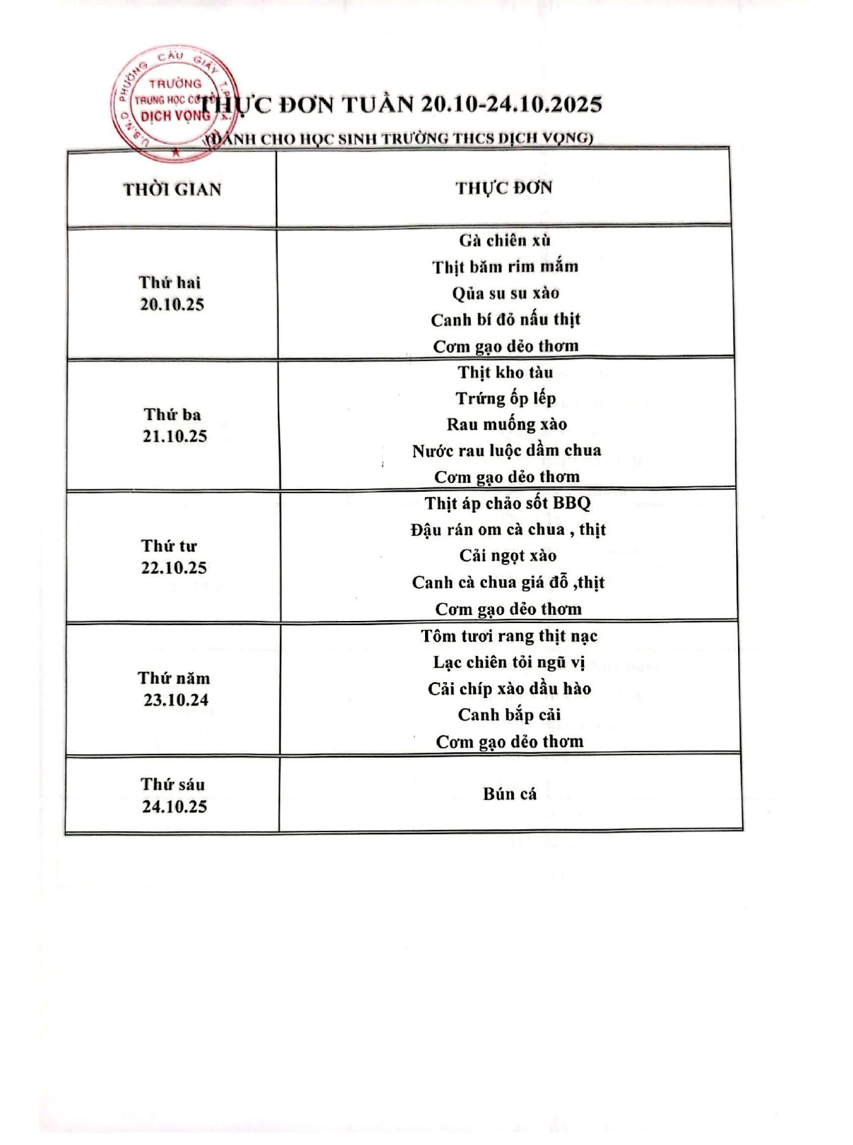 Trường THCS Dịch Vọng công khai thực đơn bán trú học sinh tuần 20/10 - 24/10/2025 như sau: