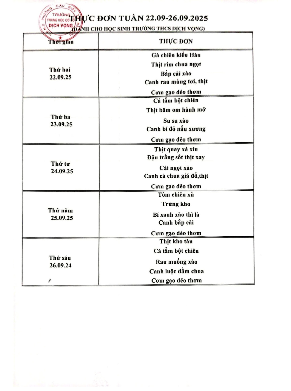 Trường THCS Dịch Vọng công khai thực đơn bán trú học sinh tuần 22/09 - 26/09/2025 như sau: