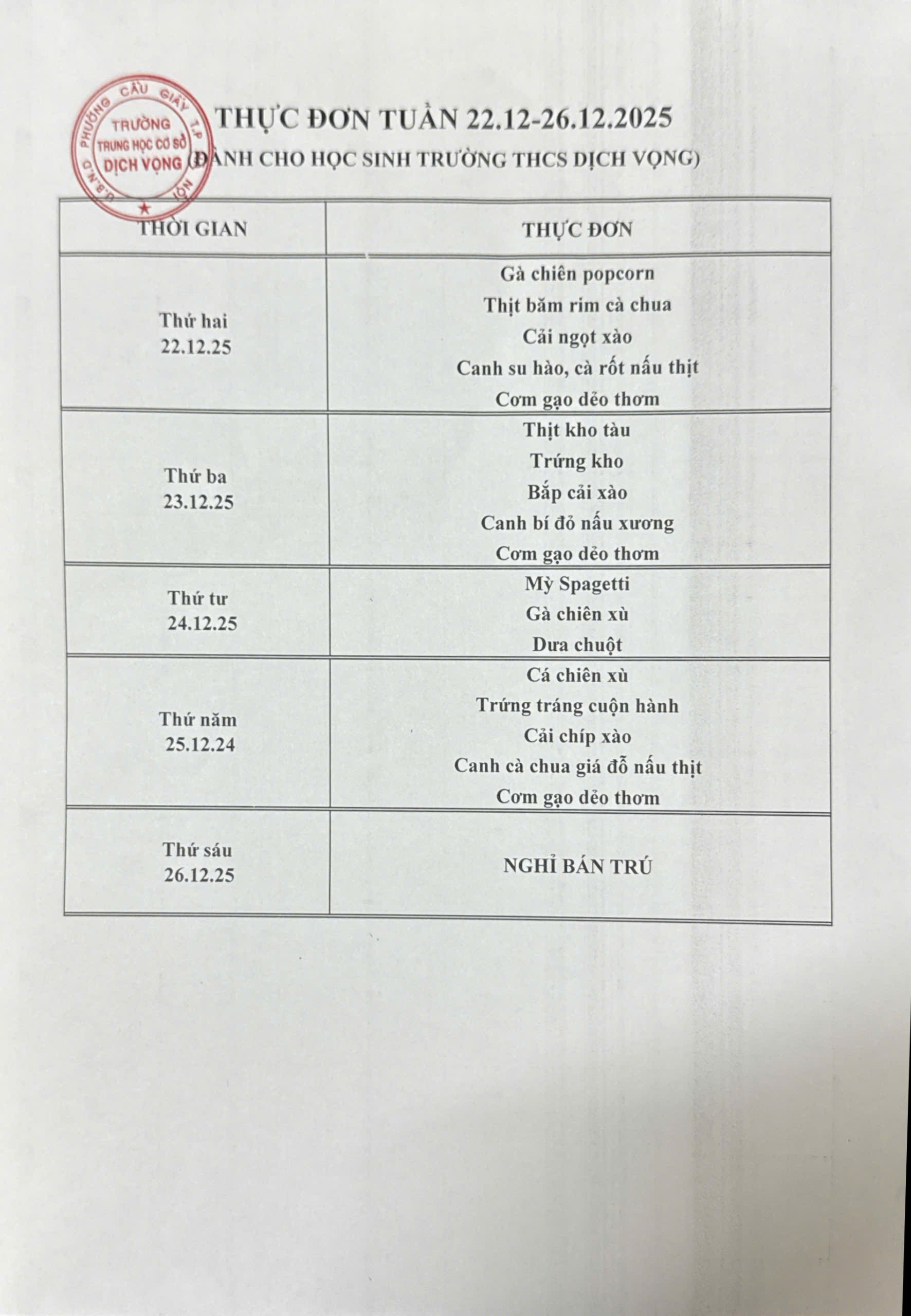 Trường THCS Dịch Vọng công khai thực đơn bán trú học sinh tuần 22/12 - 27/12/2025 như sau: