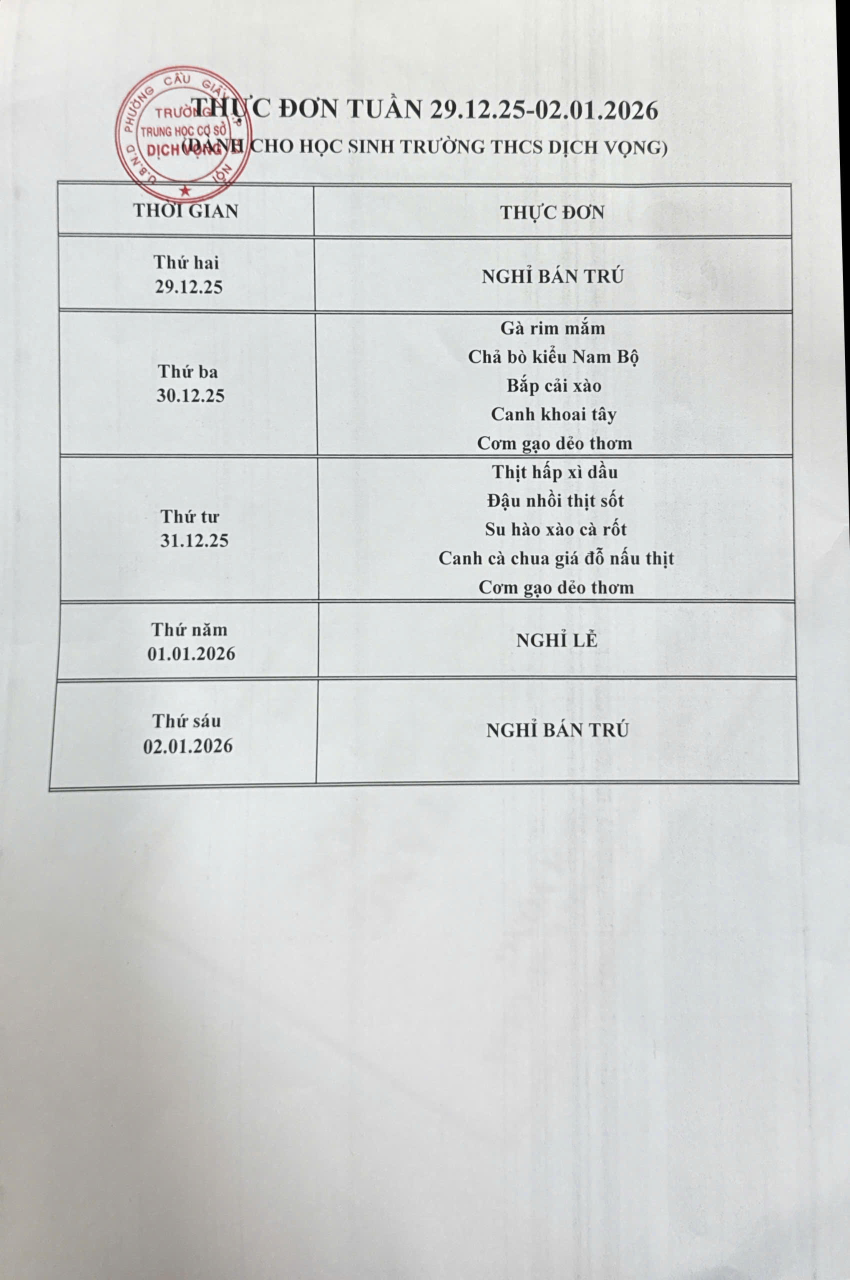 Trường THCS Dịch Vọng công khai thực đơn bán trú học sinh tuần 29/12 - 02/01/2025 như sau: