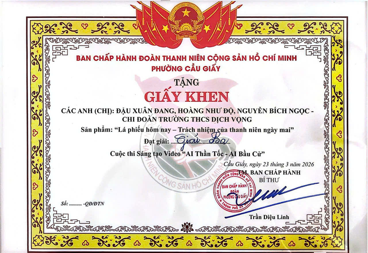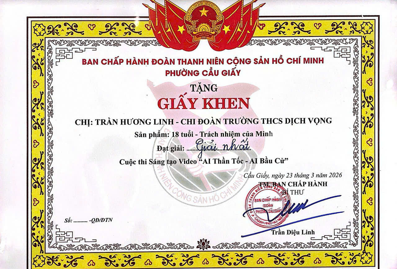🏆 Vượt qua rất nhiều các sản phẩm dự thi đầy tâm huyết, sáng tạo trên địa bàn phường Cầu Giấy, Chi đoàn trường THCS Dịch Vọng đã mang về các thành tích ấn tượng và đầy tự hào: