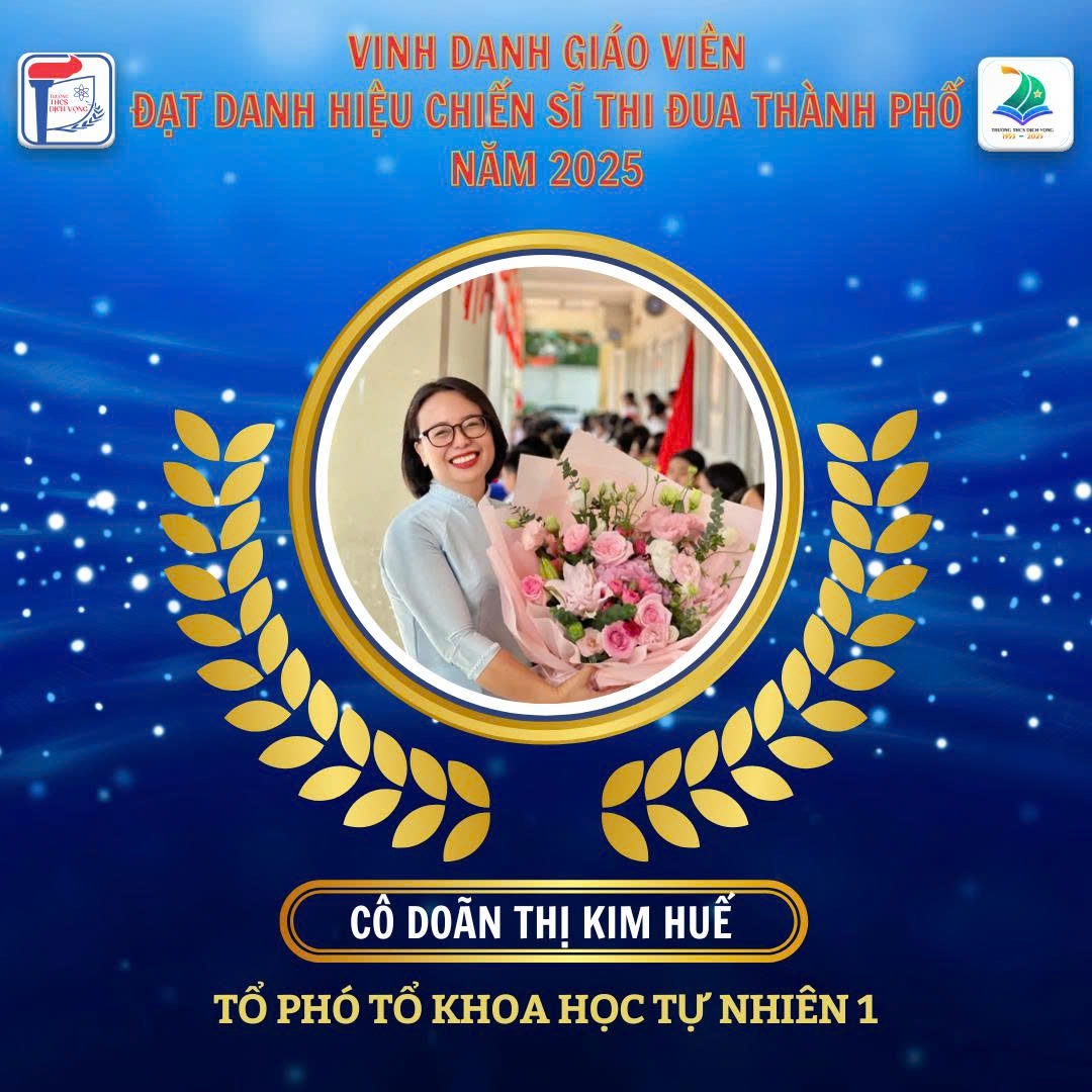 🌟 Với lòng yêu nghề sâu sắc, sự tận tụy trong từng giờ giảng và tinh thần không ngừng đổi mới, cô Doãn Thị Kim Huế – giáo viên Toán tiêu biểu của nhà trường – đã xuất sắc được trao tặng danh hiệu Chiến sĩ thi đua cấp thành phố năm 2025.