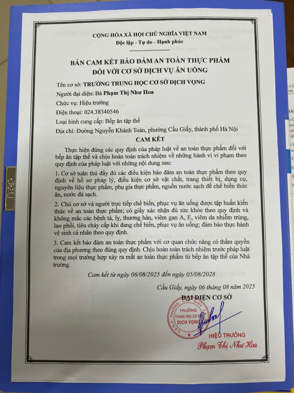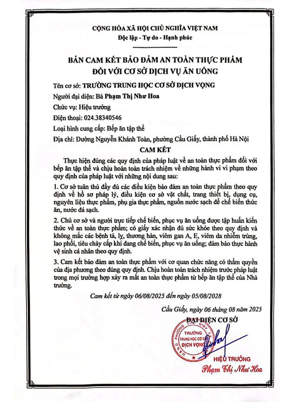 CÔNG KHAI: BẢN CAM KẾT ĐẢM BẢO AN TOÀN THỰC PHẨM ĐỐI VỚI CƠ SỞ DỊCH VỤ ĂN UỐNG