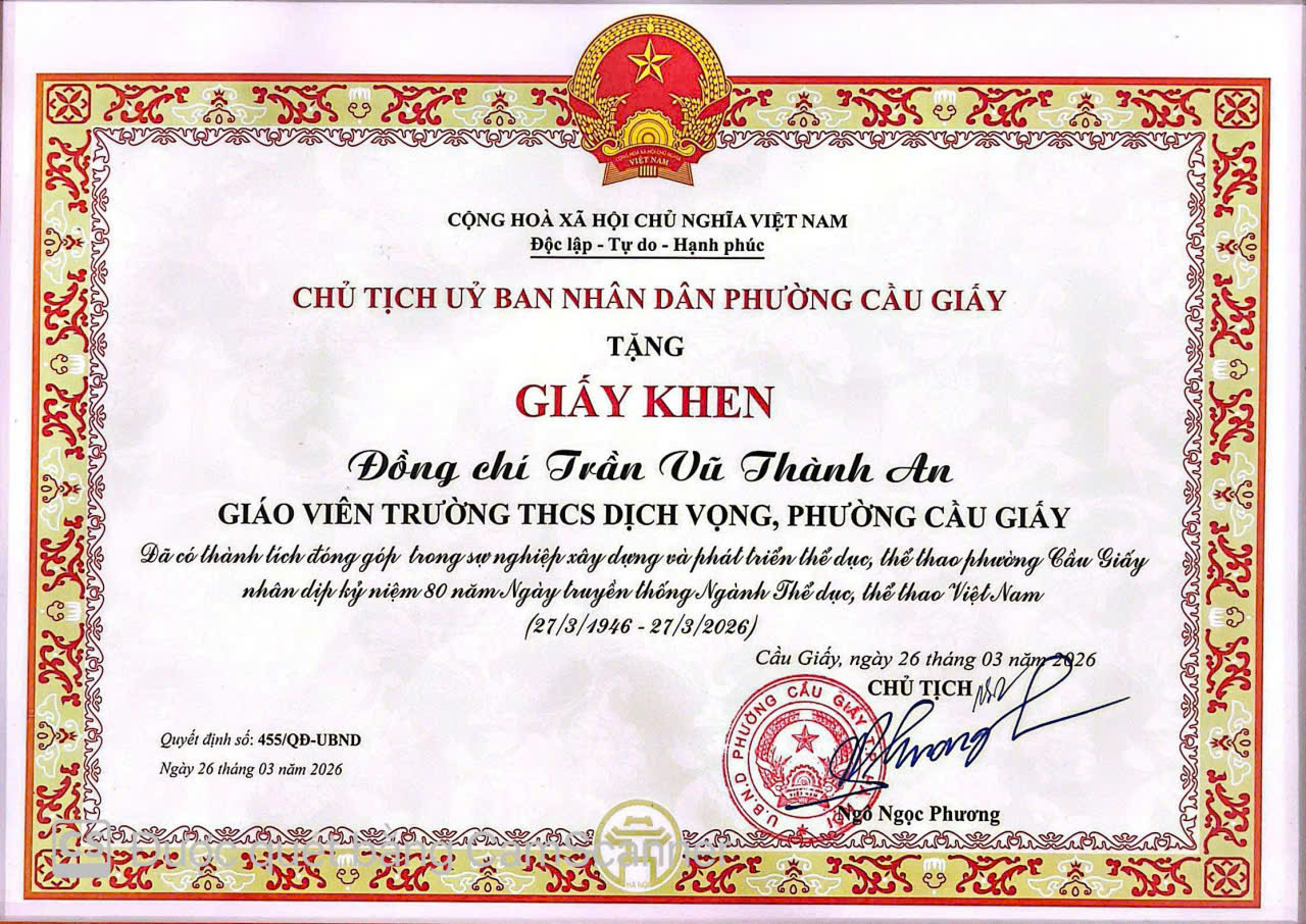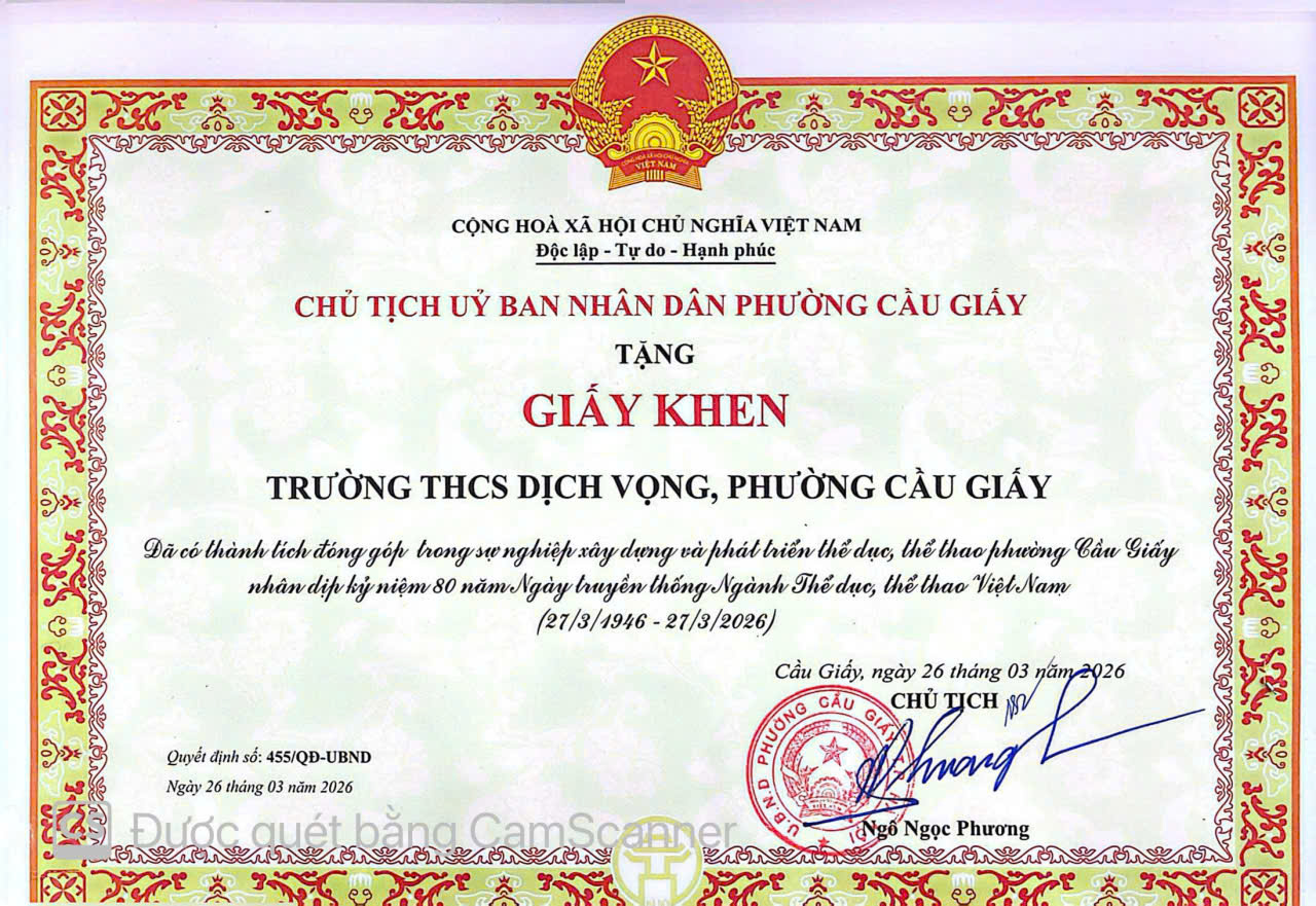 ⚜️ Ghi nhận những đóng góp của tập thể, cá nhân trên địa bàn phường, tập thể trường THCS Dịch Vọng, cô giáo Nguyễn Thị Mỹ Linh - Tổ trưởng tổ GDTC-NT và thầy giáo Trần Vũ Thành An- Giáo viên tổ GDTC-NT đã vinh dự nhận Giấy khen của Chủ tịch UBND phường Cầu Giấy “đã có thành tích đóng góp trong sự nghiệp xây dựng và phát triển thể dục, thể thao phường Cầu Giấy nhân dịp kỉ niệm 80 năm Ngày truyền thống Ngành Thể dục, thể thao Việt Nam (27/3/1946 – 27/3/2026)”. Đây là sự ghi nhận xứng đáng cho những nỗ lực, tâm huyết và tinh thần cống hiến không ngừng của các thầy cô.