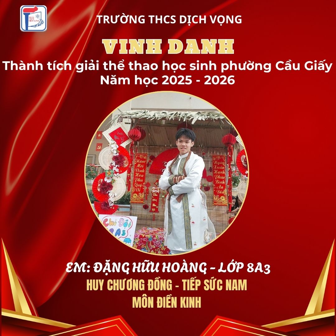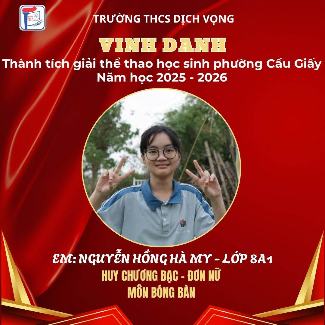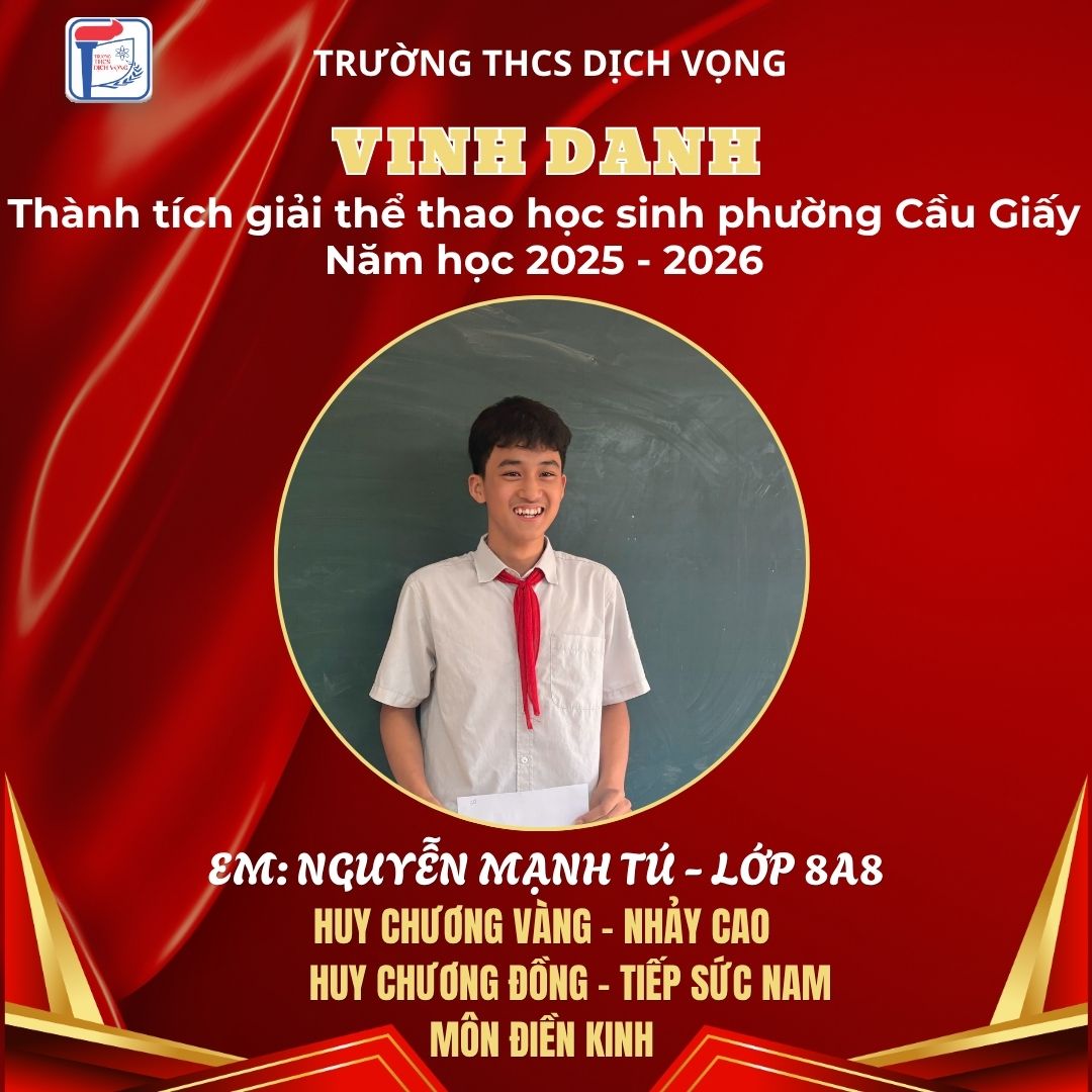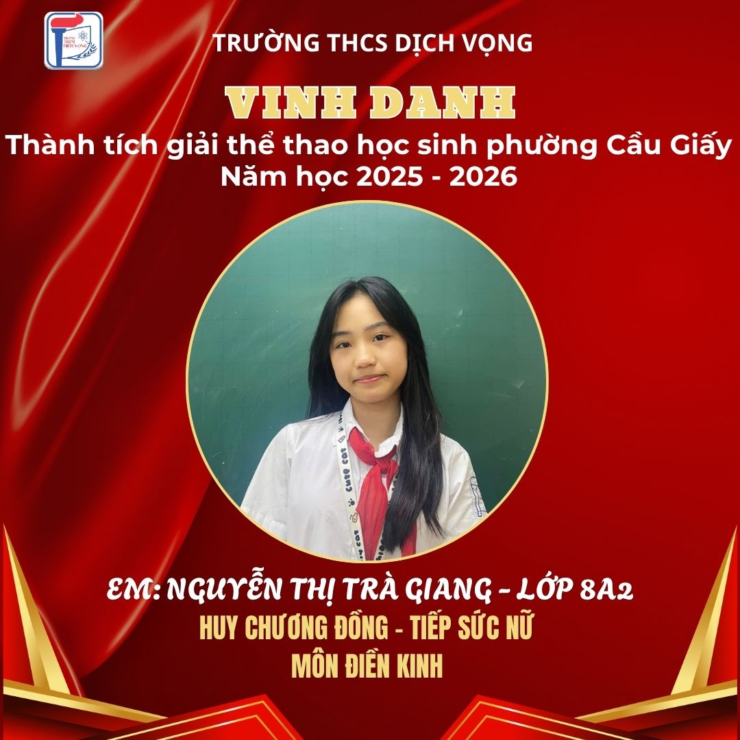 Trong không khí sôi nổi của Giải Thể thao học sinh phường Cầu Giấy năm học 2025–2026, học sinh Trường THCS Dịch Vọng đã thi đấu đầy nỗ lực, bản lĩnh và đạt được nhiều thành tích ấn tượng, góp phần khẳng định phong trào thể dục thể thao của nhà trường.