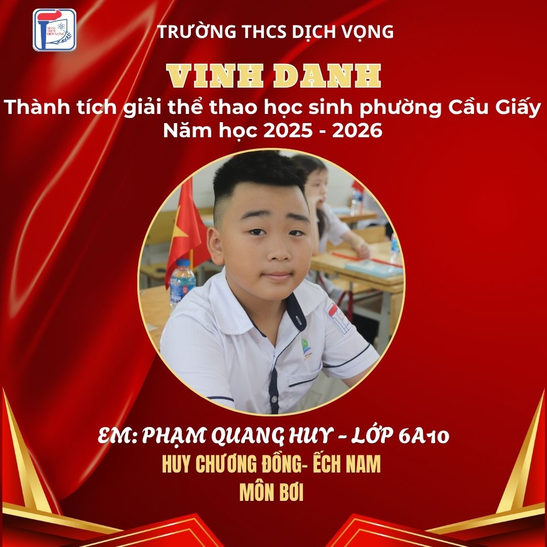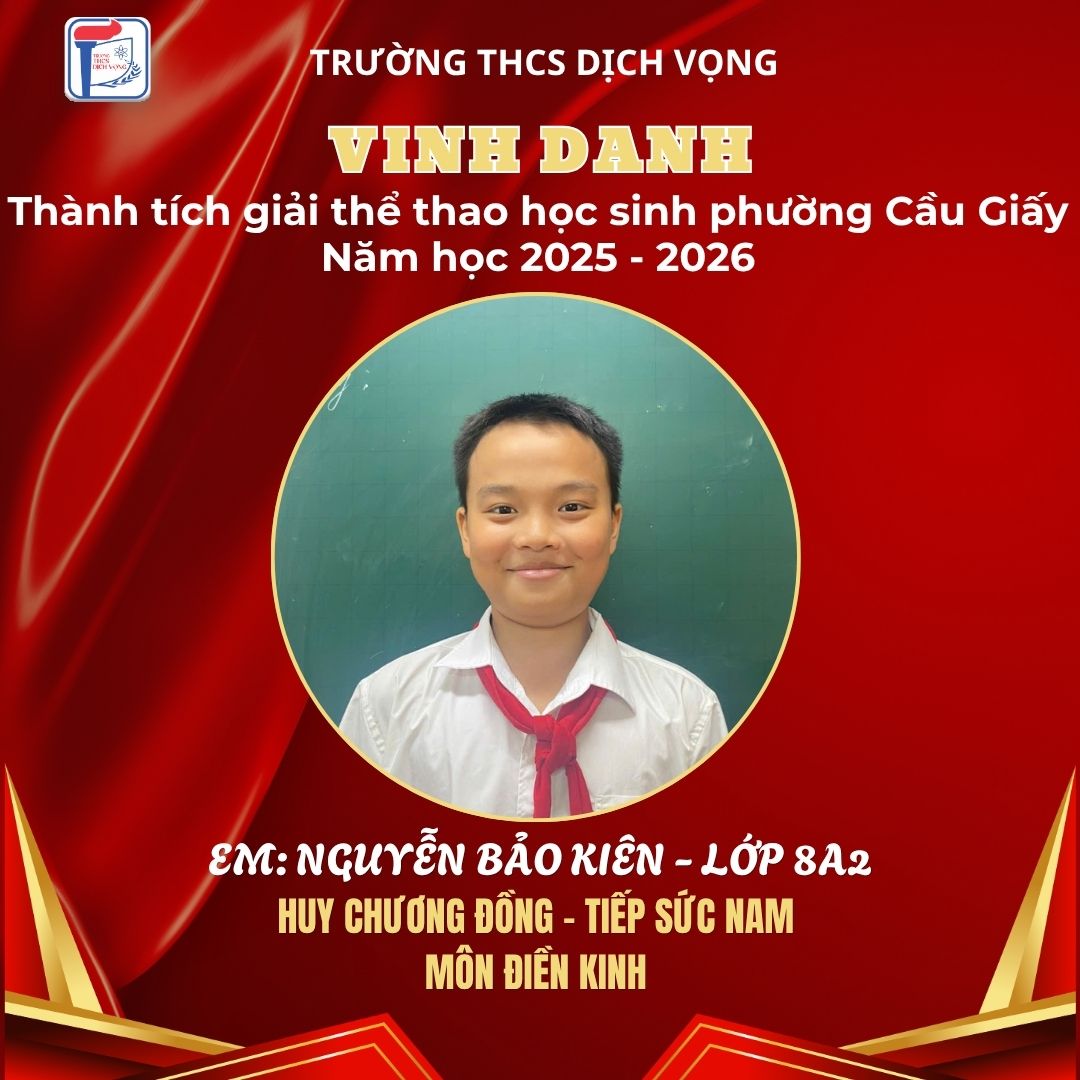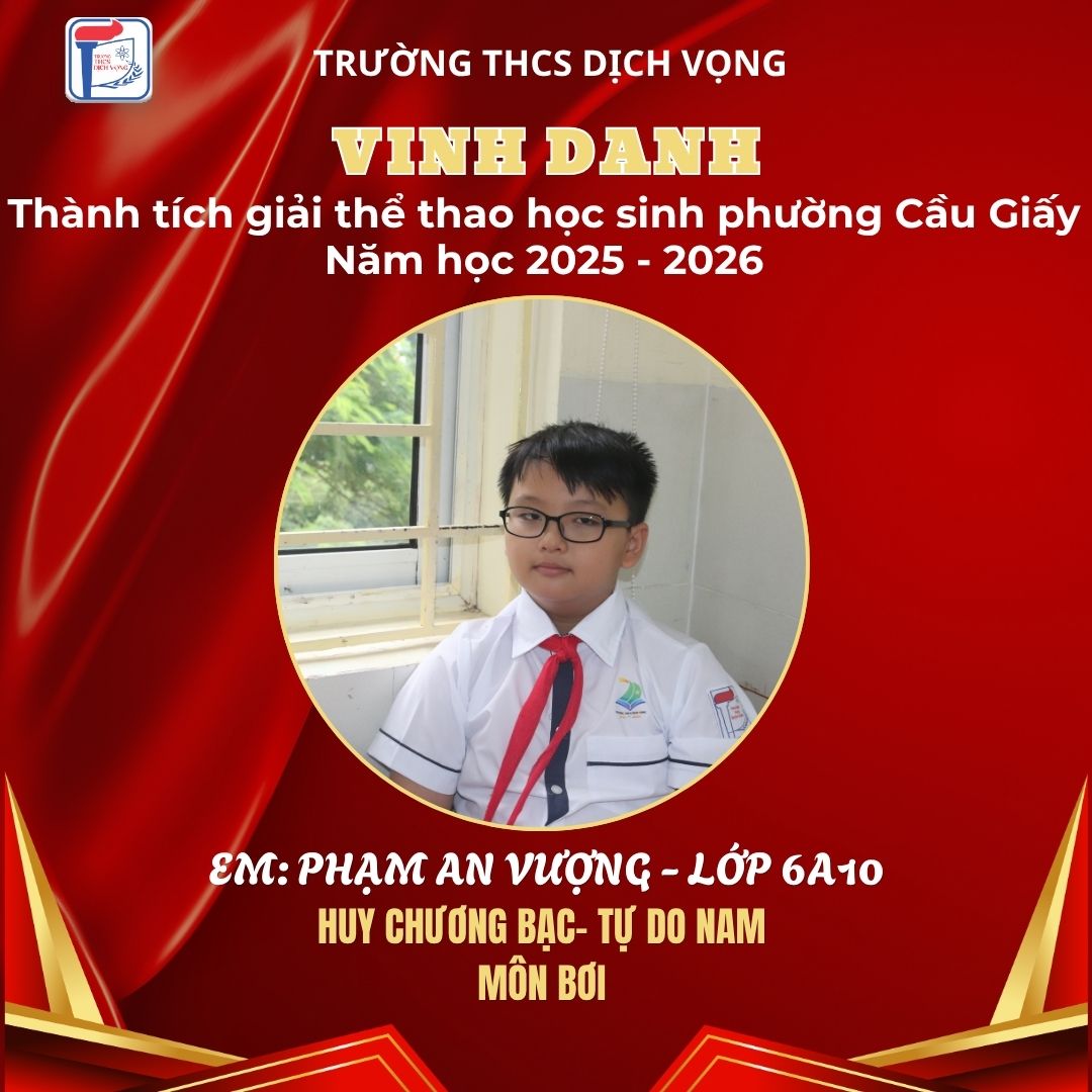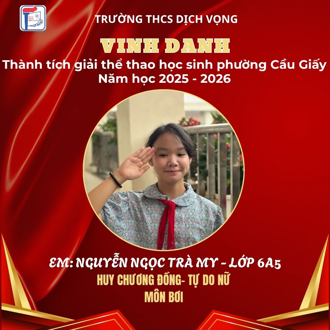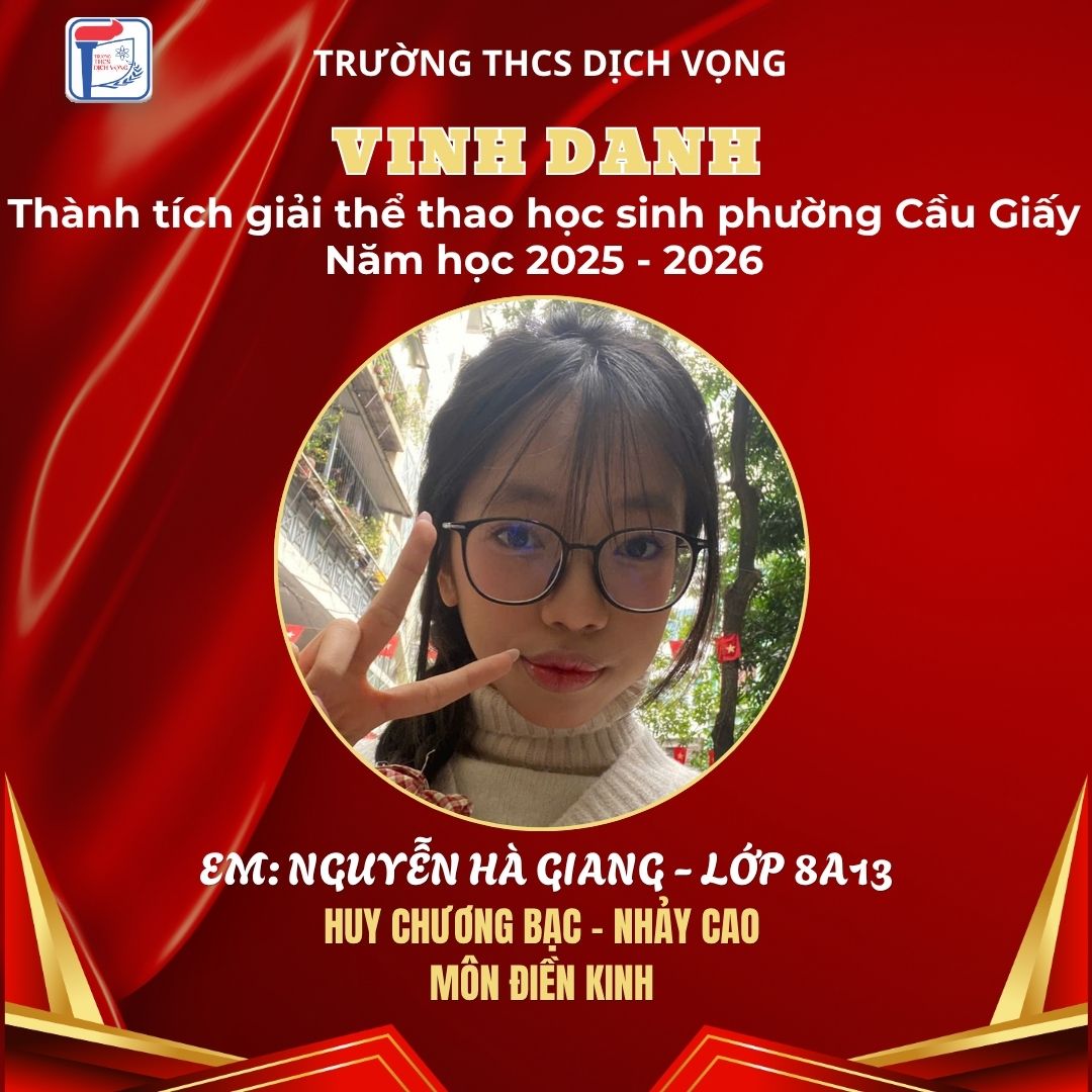 Trong không khí sôi nổi của Giải Thể thao học sinh phường Cầu Giấy năm học 2025–2026, học sinh Trường THCS Dịch Vọng đã thi đấu đầy nỗ lực, bản lĩnh và đạt được nhiều thành tích ấn tượng, góp phần khẳng định phong trào thể dục thể thao của nhà trường.