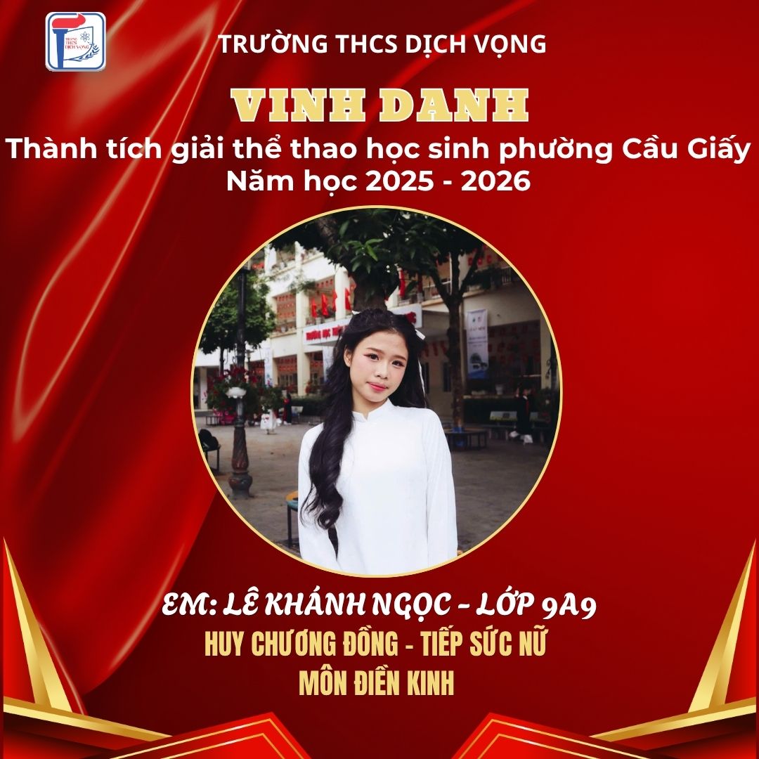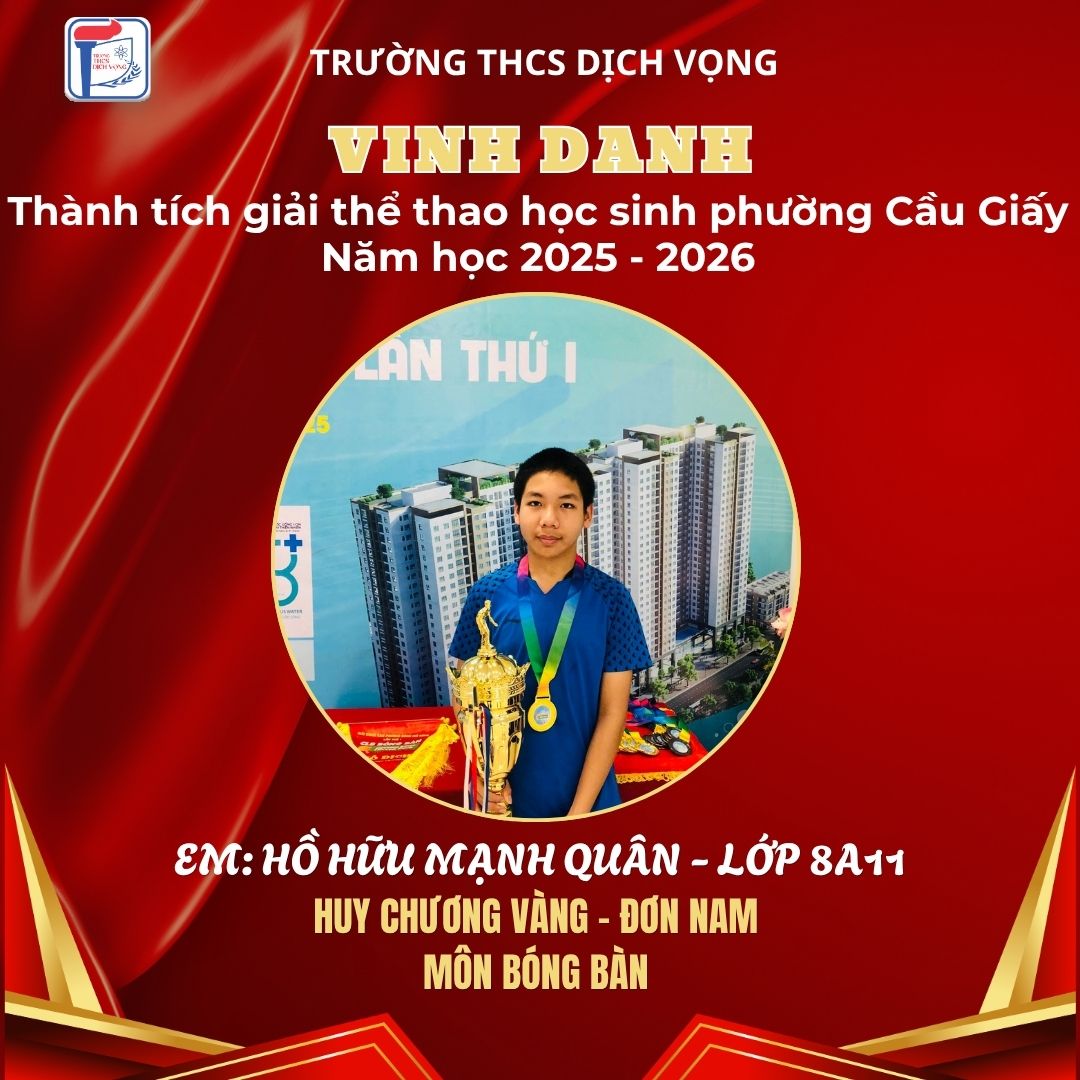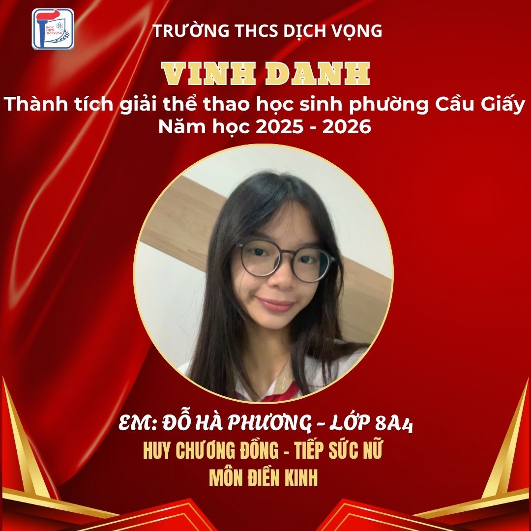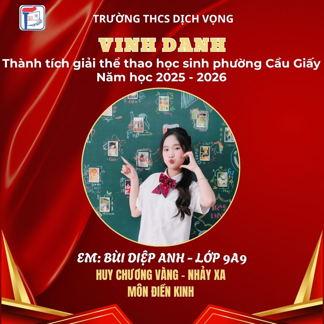 Trong không khí sôi nổi của Giải Thể thao học sinh phường Cầu Giấy năm học 2025–2026, học sinh Trường THCS Dịch Vọng đã thi đấu đầy nỗ lực, bản lĩnh và đạt được nhiều thành tích ấn tượng, góp phần khẳng định phong trào thể dục thể thao của nhà trường.