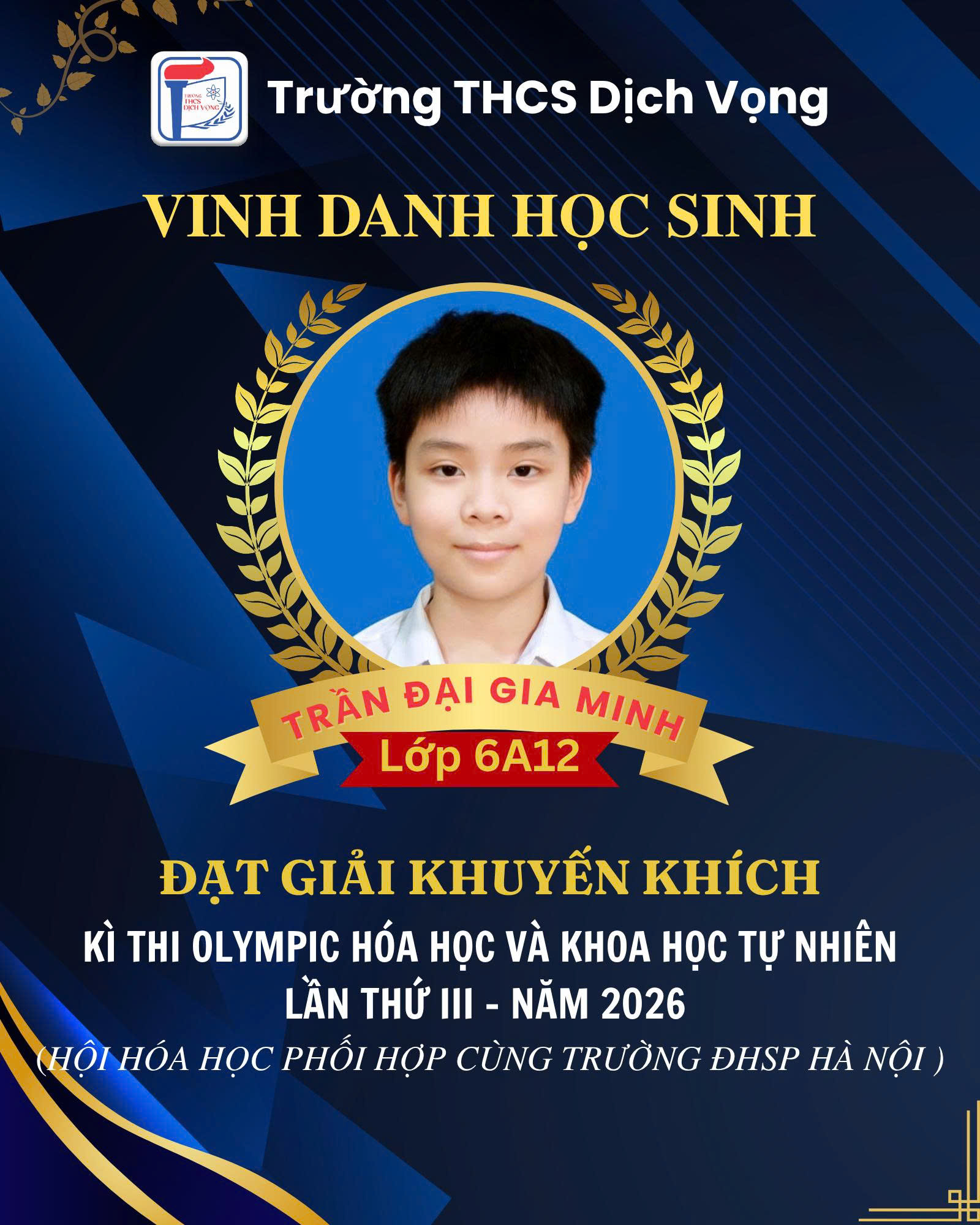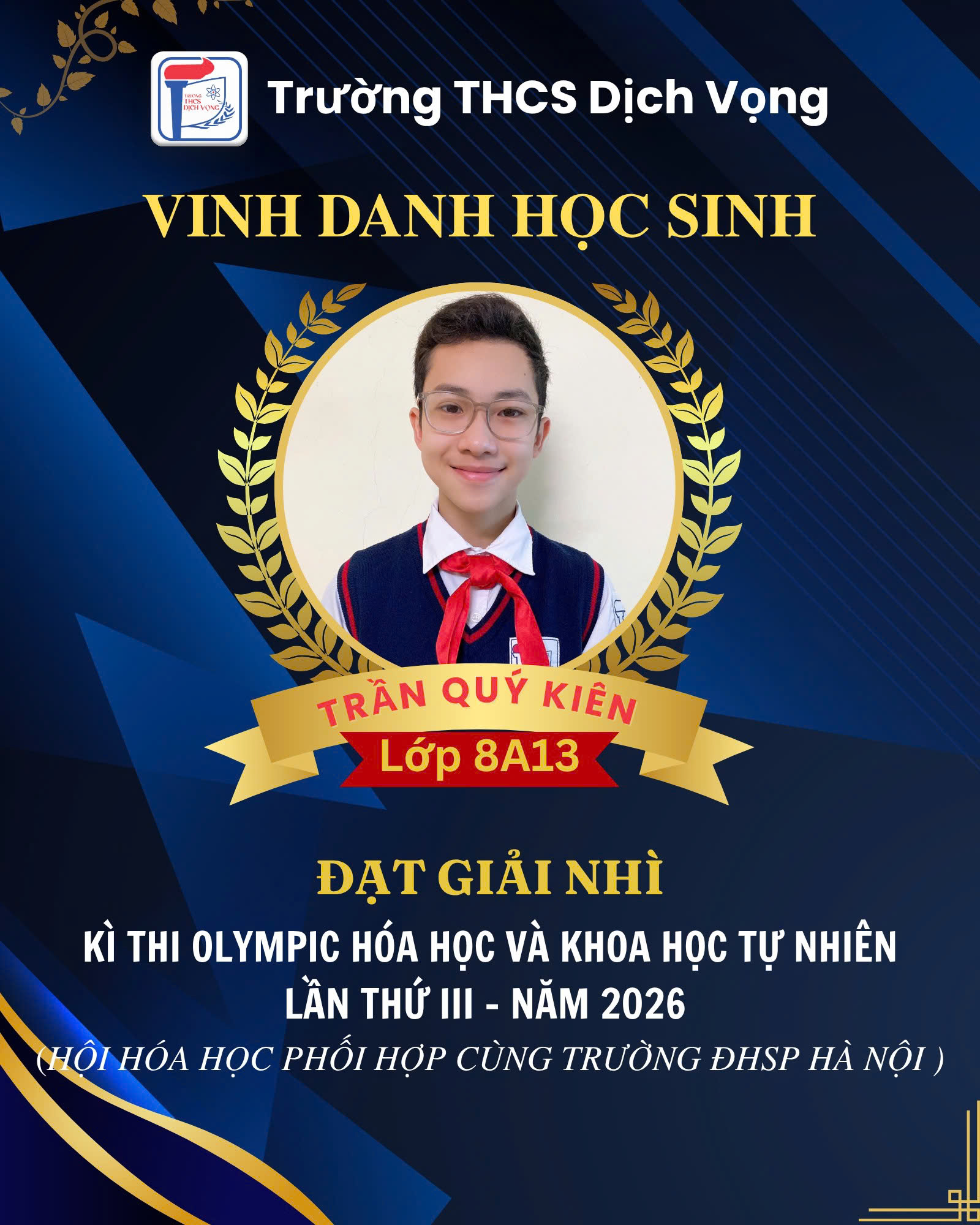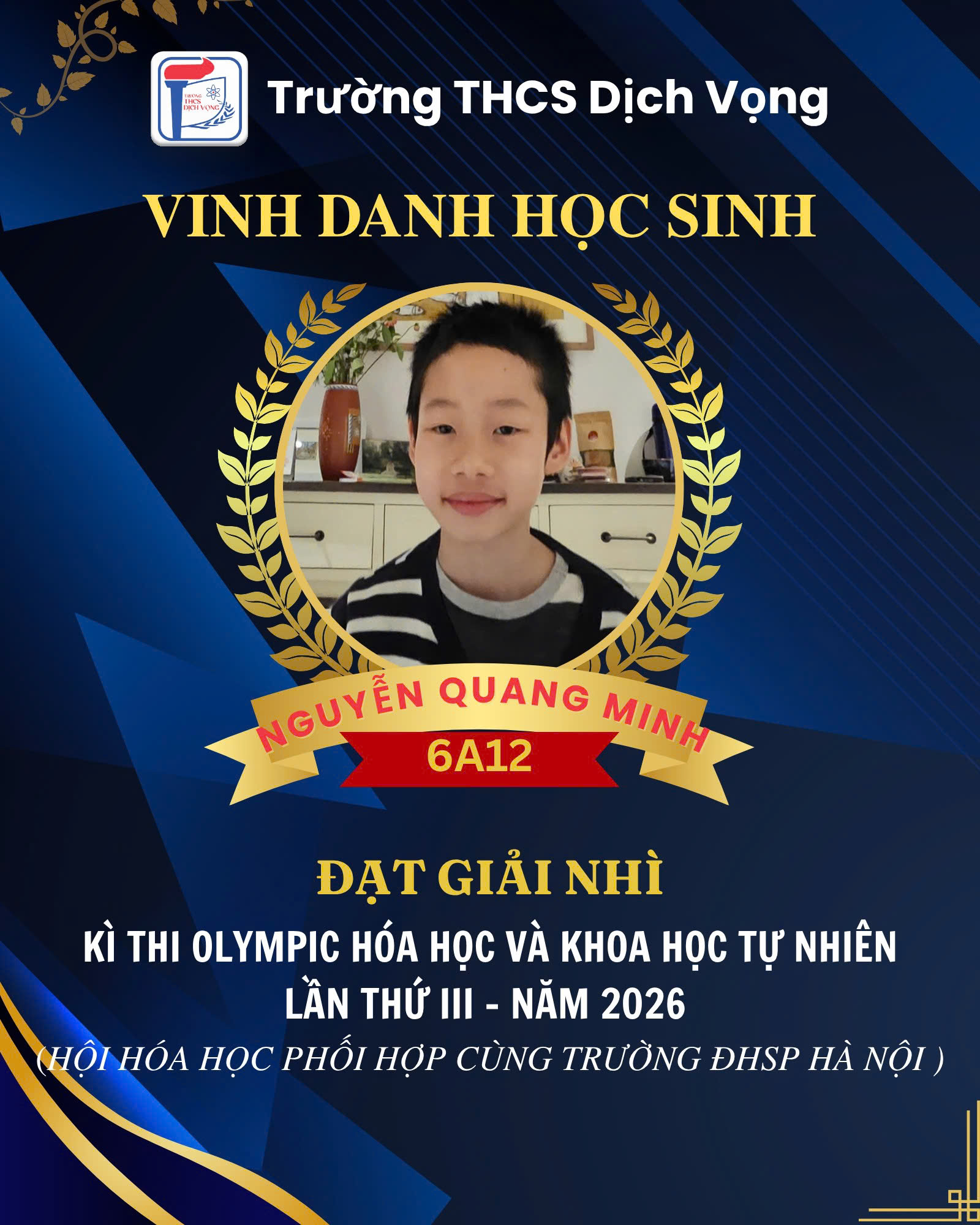 💕Với niềm đam mê khám phá và tinh thần học tập không ngừng, học sinh Trường THCS Dịch Vọng đã xuất sắc ghi dấu ấn tại Cuộc thi Olympic Hóa học và Khoa học Tự nhiên lần thứ III năm 2026 do Hội Hóa học phối hợp cùng Trường Đại học Sư phạm Hà Nội tổ chức.