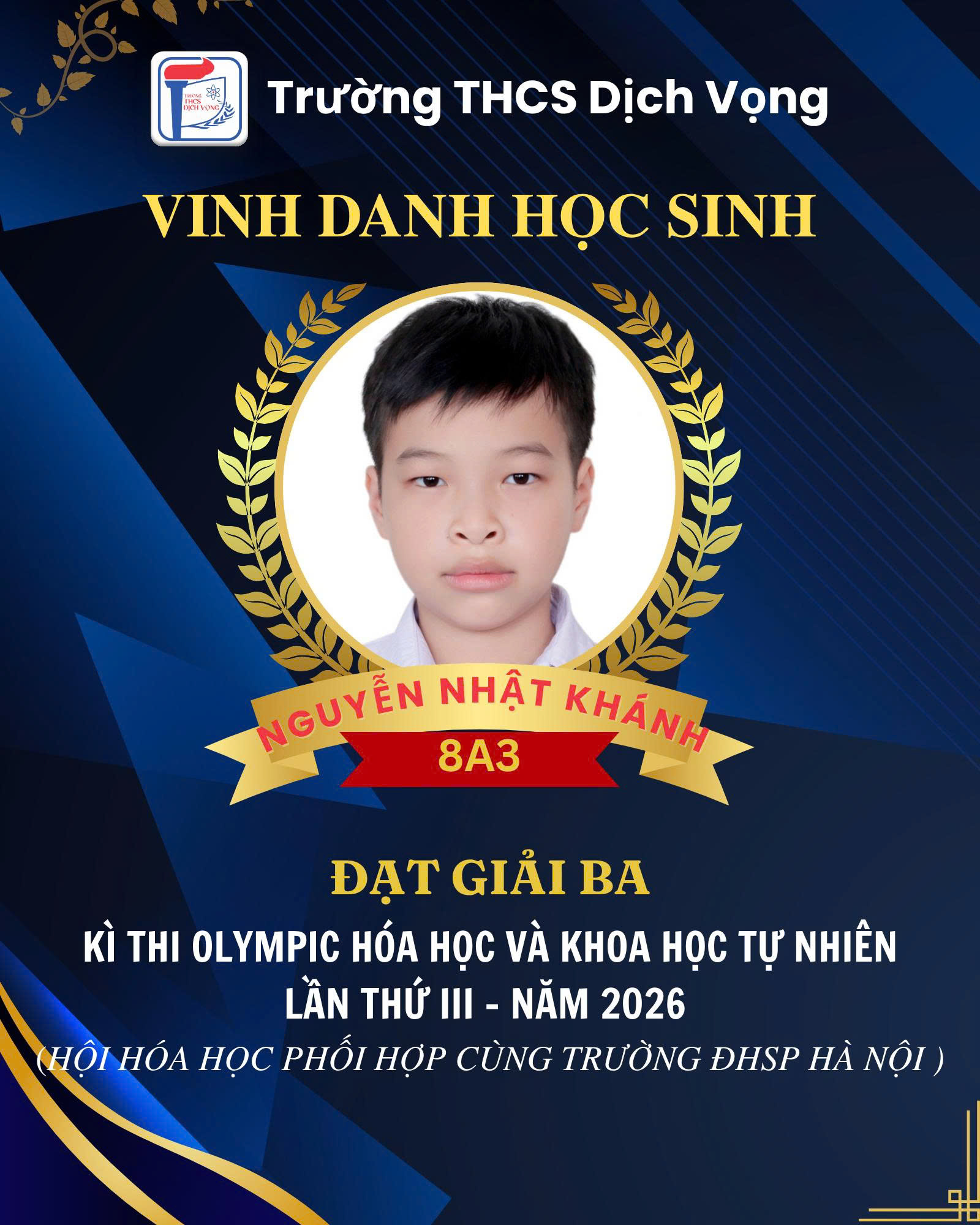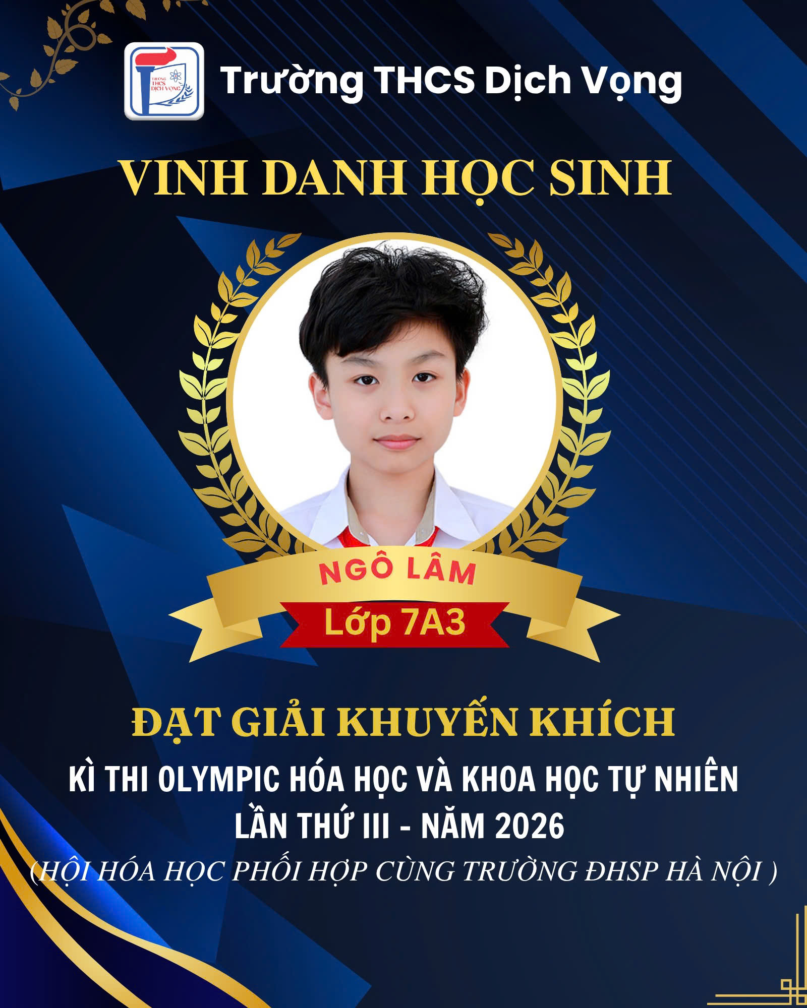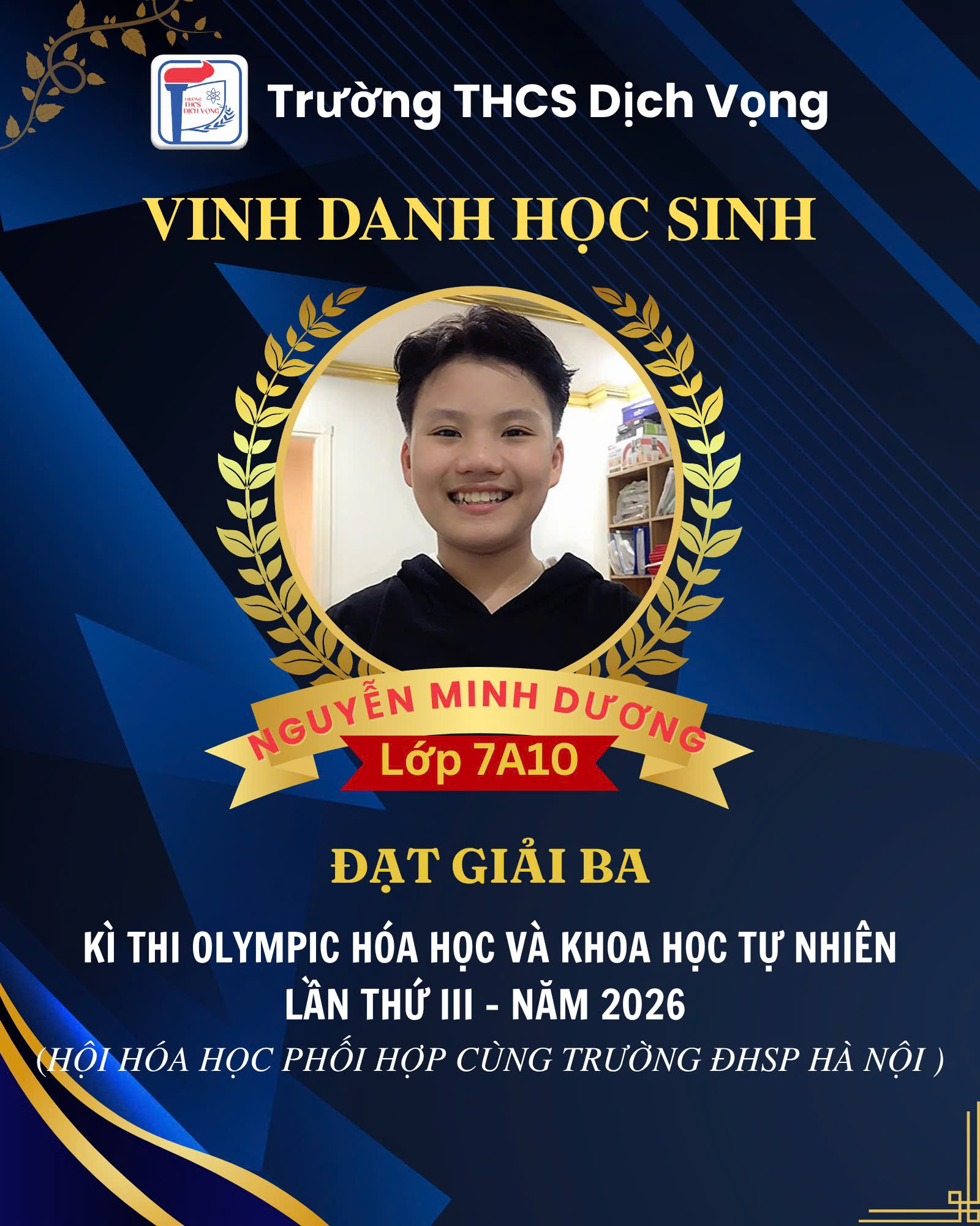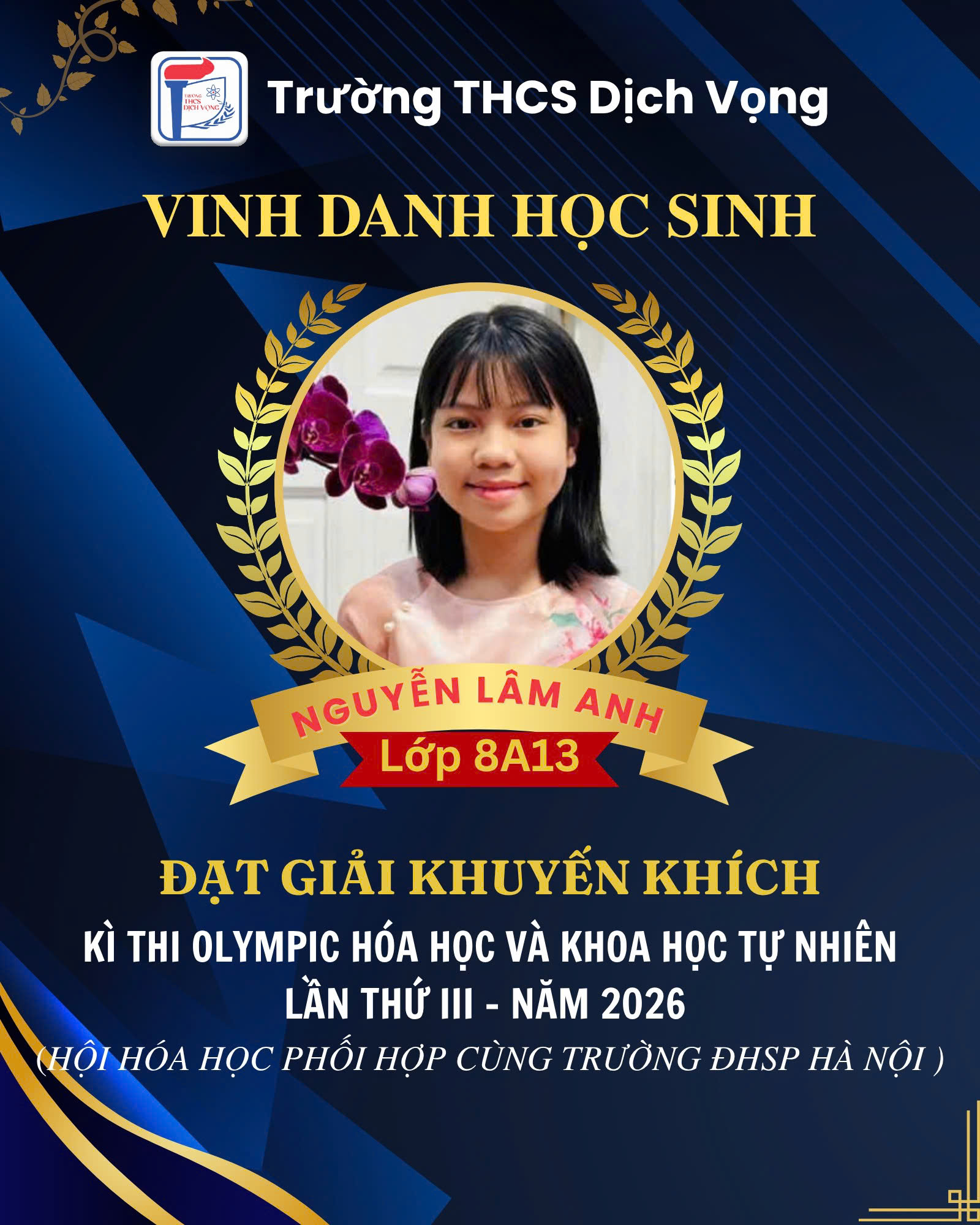 💕Với niềm đam mê khám phá và tinh thần học tập không ngừng, học sinh Trường THCS Dịch Vọng đã xuất sắc ghi dấu ấn tại Cuộc thi Olympic Hóa học và Khoa học Tự nhiên lần thứ III năm 2026 do Hội Hóa học phối hợp cùng Trường Đại học Sư phạm Hà Nội tổ chức.