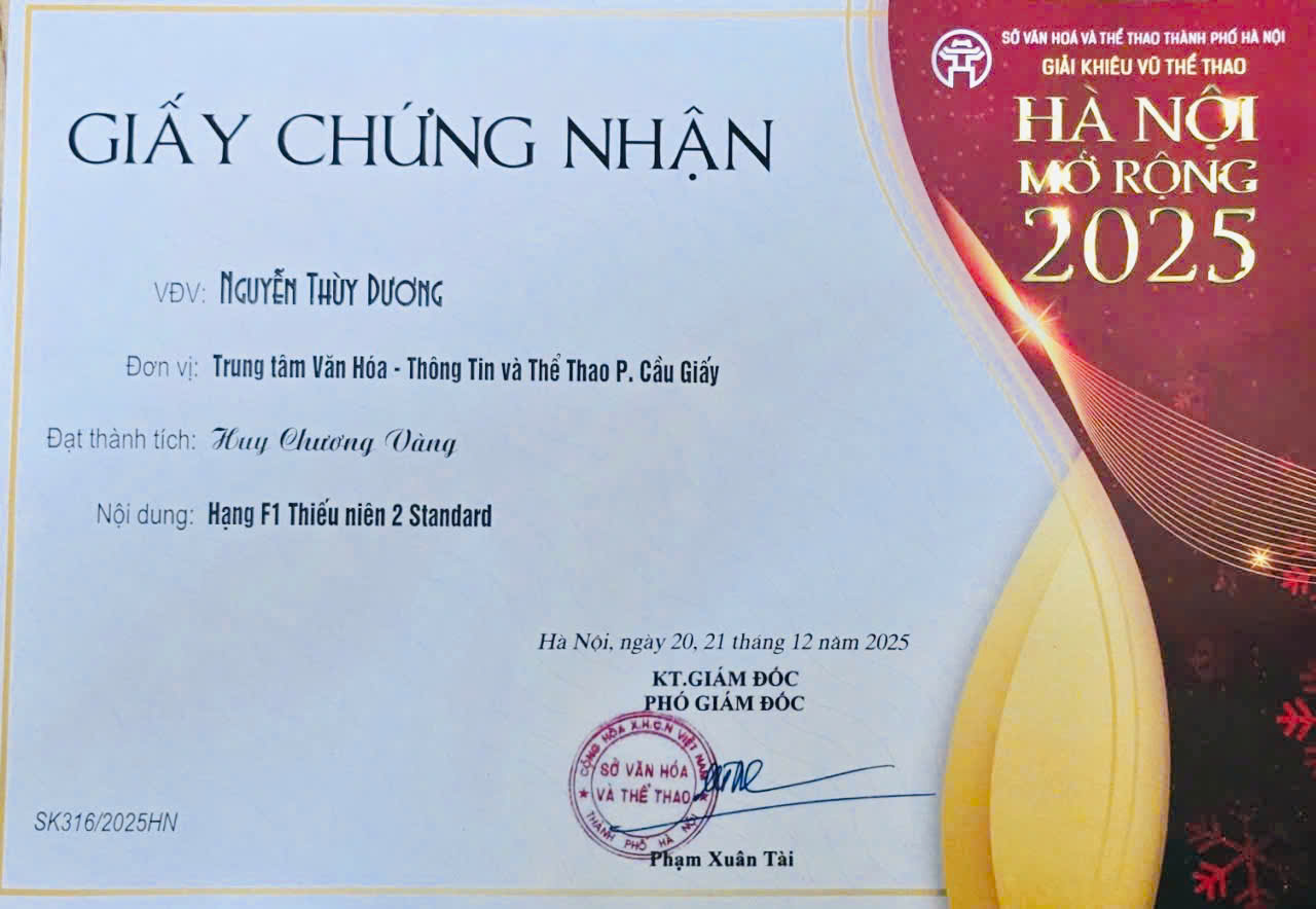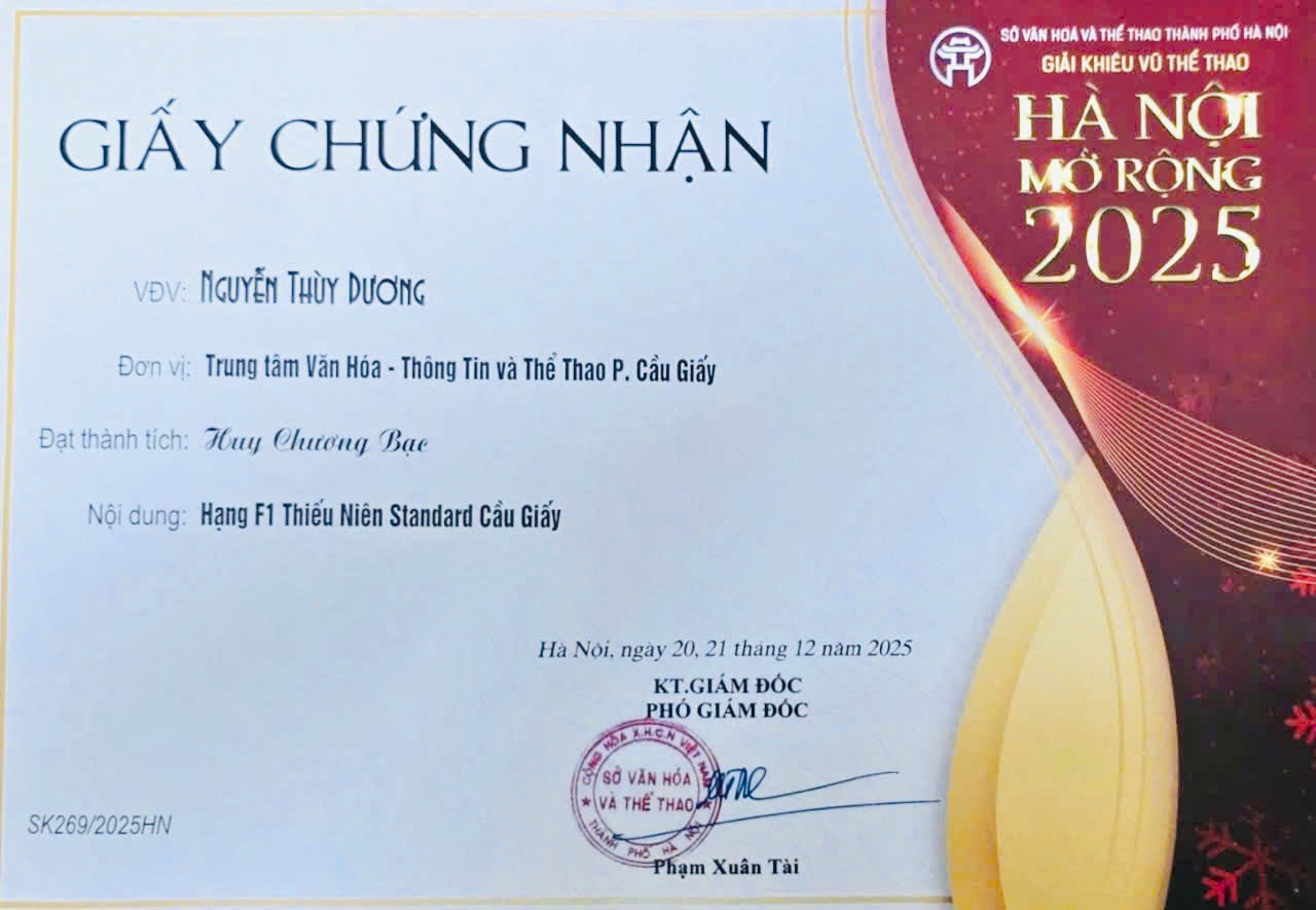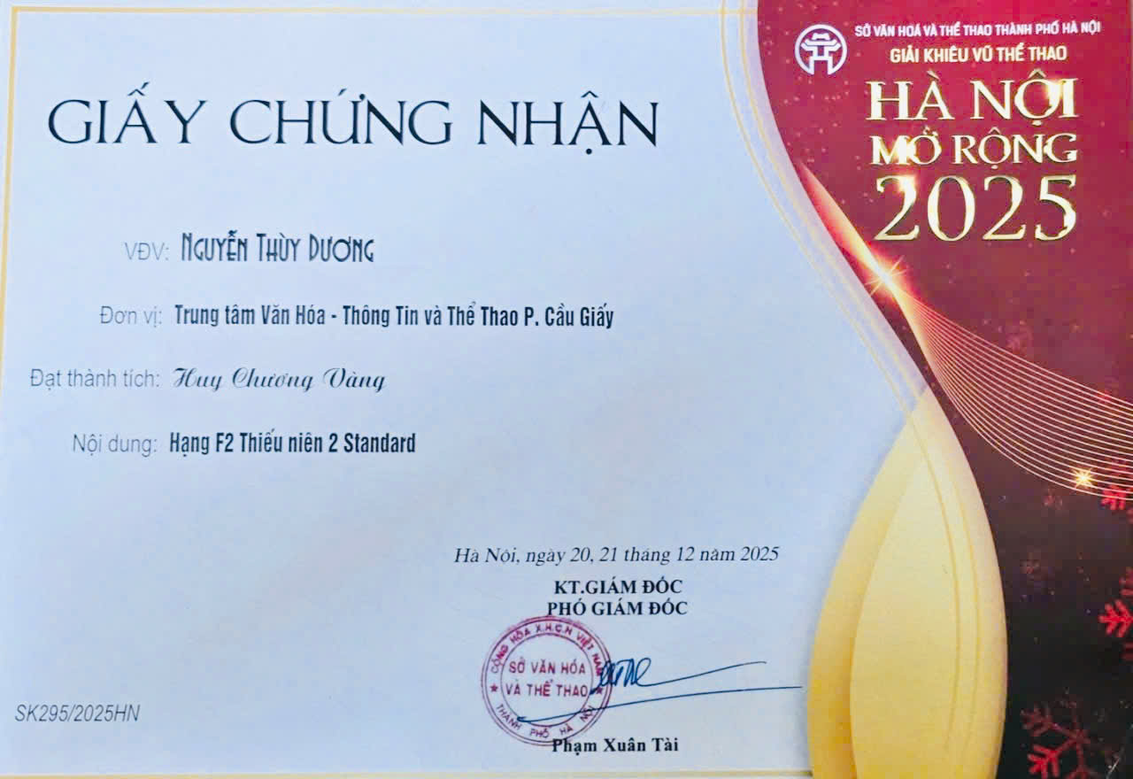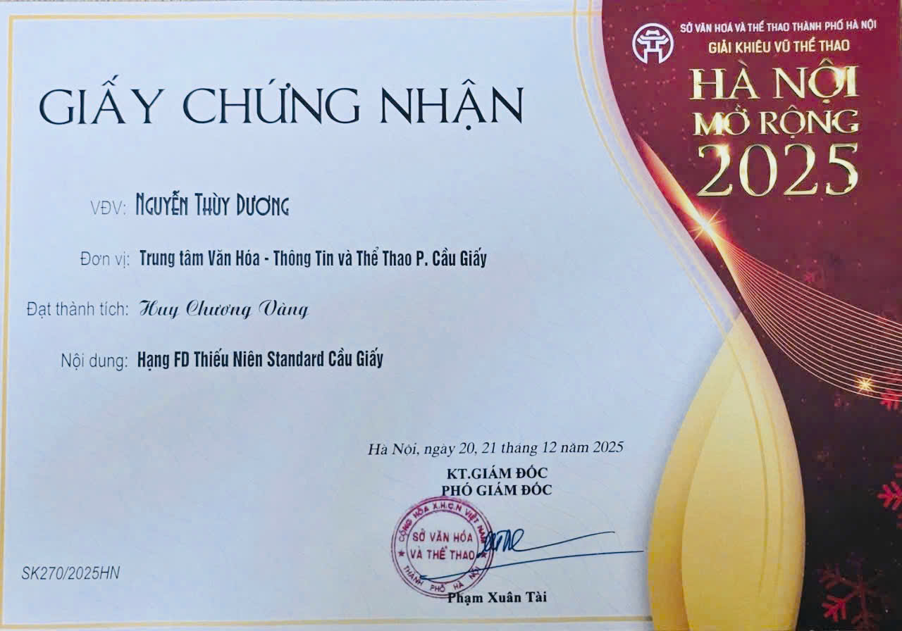 🎉 Trường THCS Dịch Vọng chúc mừng em Nguyễn Thùy Dương – học sinh lớp 9A11, Liên đội phó Ban Chỉ huy Liên đội. Với niềm đam mê dành cho bộ môn khiêu vũ thể thao cùng tinh thần nỗ lực không ngừng, em đã xuất sắc gặt hái nhiều thành tích ấn tượng tại Giải Khiêu vũ thể thao Hà Nội mở rộng năm 2025 do Sở Văn hóa và Thể thao thành phố Hà Nội tổ chức.