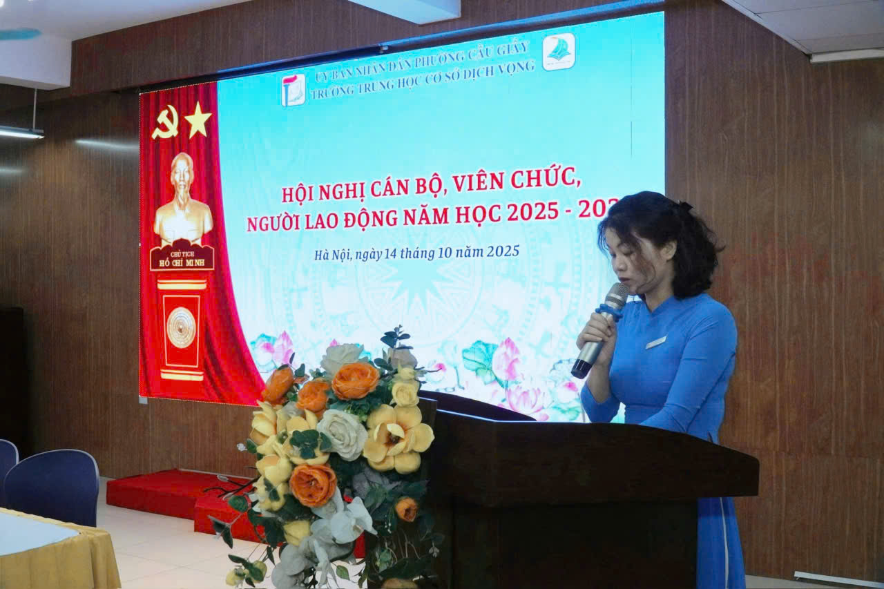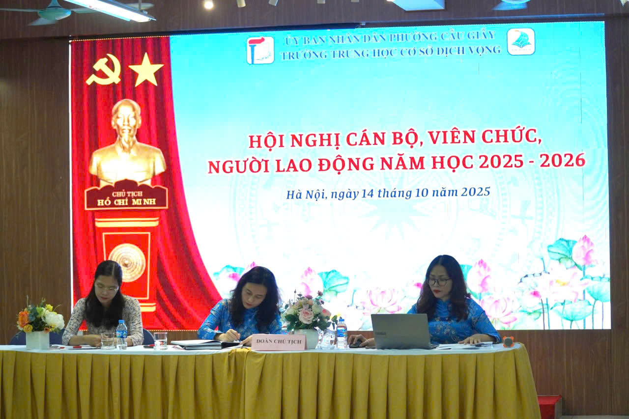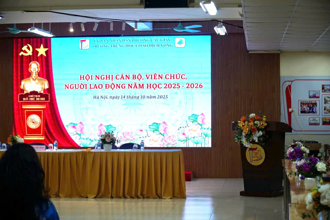 📍Nhằm tổng kết, đánh giá kết quả thực hiện nhiệm vụ năm học 2024 – 2025 và triển khai phương hướng, nhiệm vụ năm học 2025 – 2026, chiều ngày 14/10/2025, Trường THCS Dịch Vọng đã long trọng tổ chức Hội nghị Cán bộ, Viên chức, Người lao động năm học 2025 – 2026 với không khí trang nghiêm, dân chủ và đầy cởi mở.