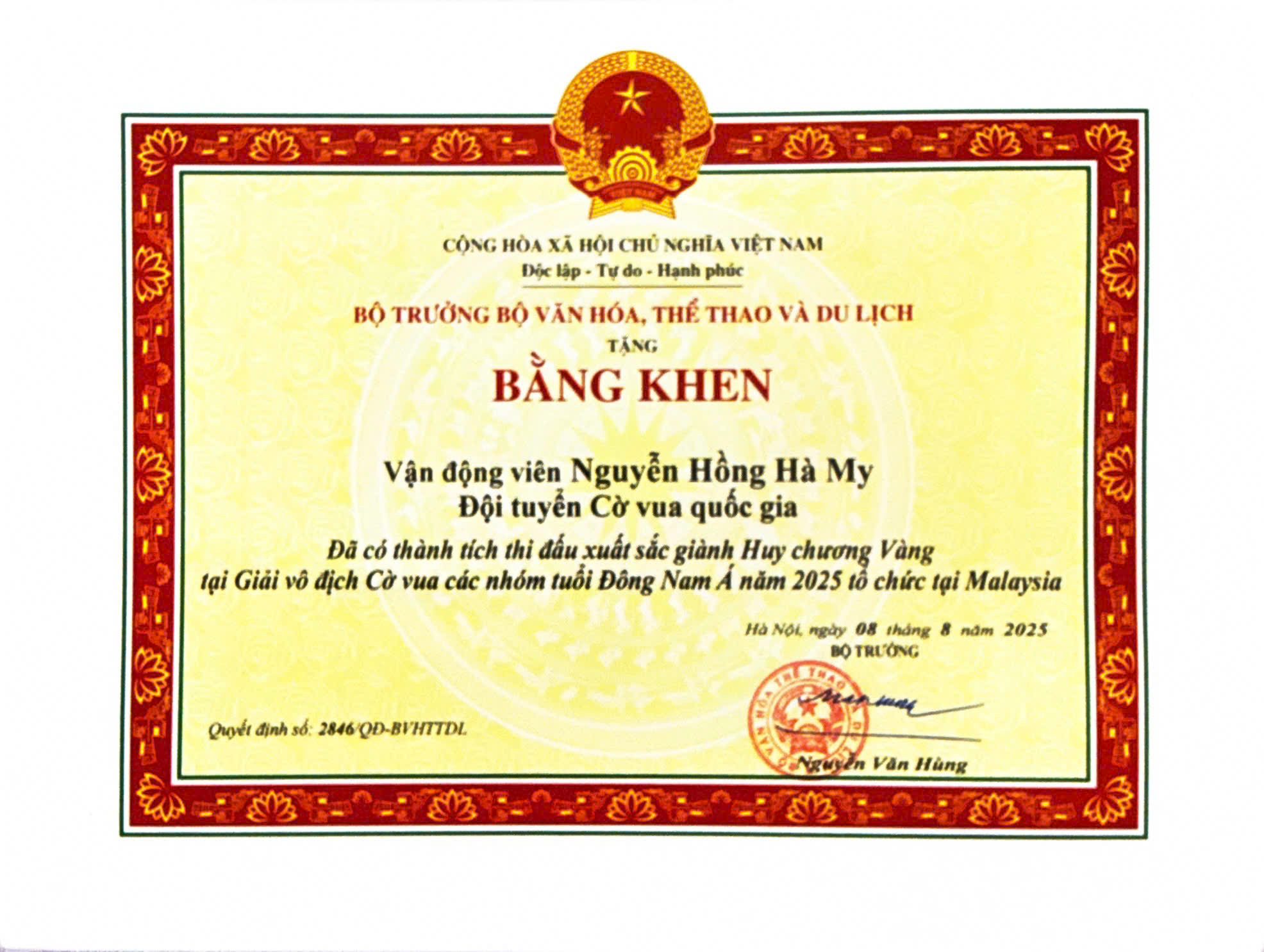 🏅 Với thành tích thi đấu ấn tượng trên đấu trường khu vực, em Nguyễn Hồng Hà My đã vinh dự được Bộ trưởng Bộ Văn hóa, Thể thao và Du lịch trao tặng Bằng khen, ghi nhận những nỗ lực, bản lĩnh và tài năng nổi bật của một vận động viên trẻ Việt Nam.