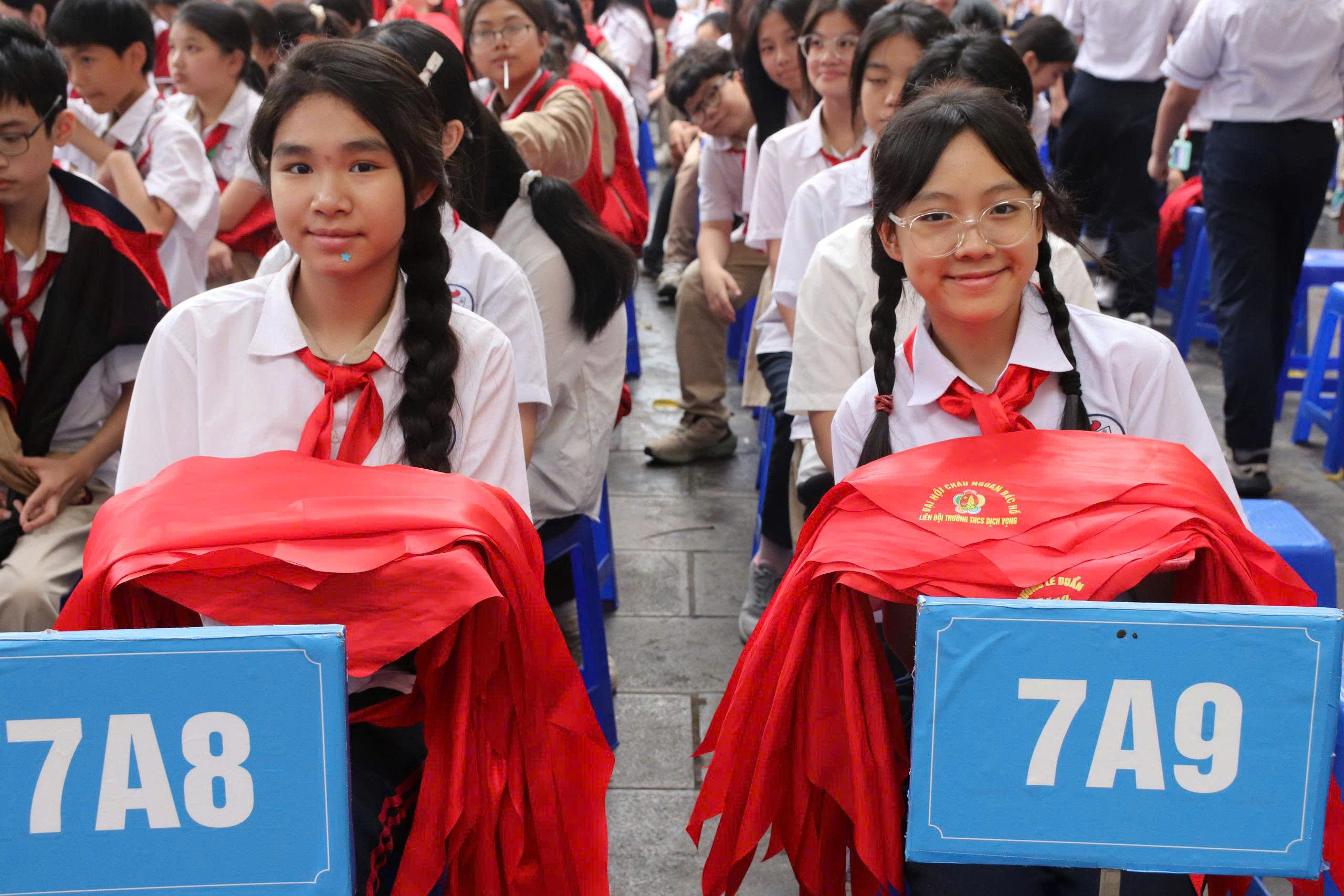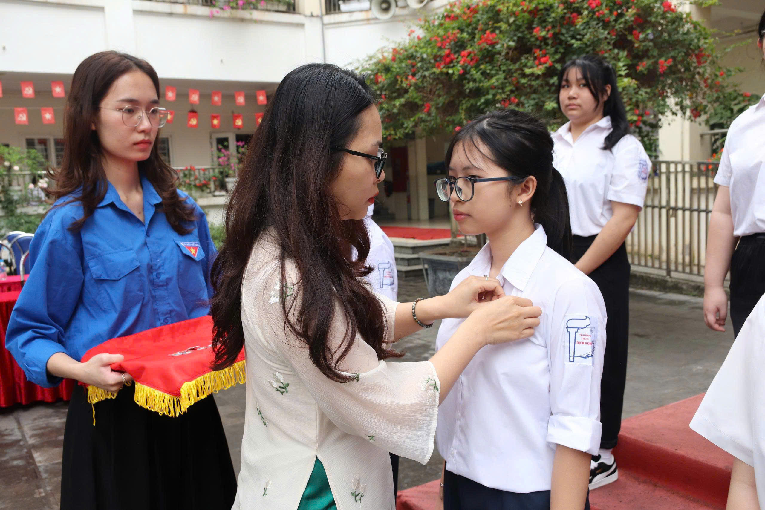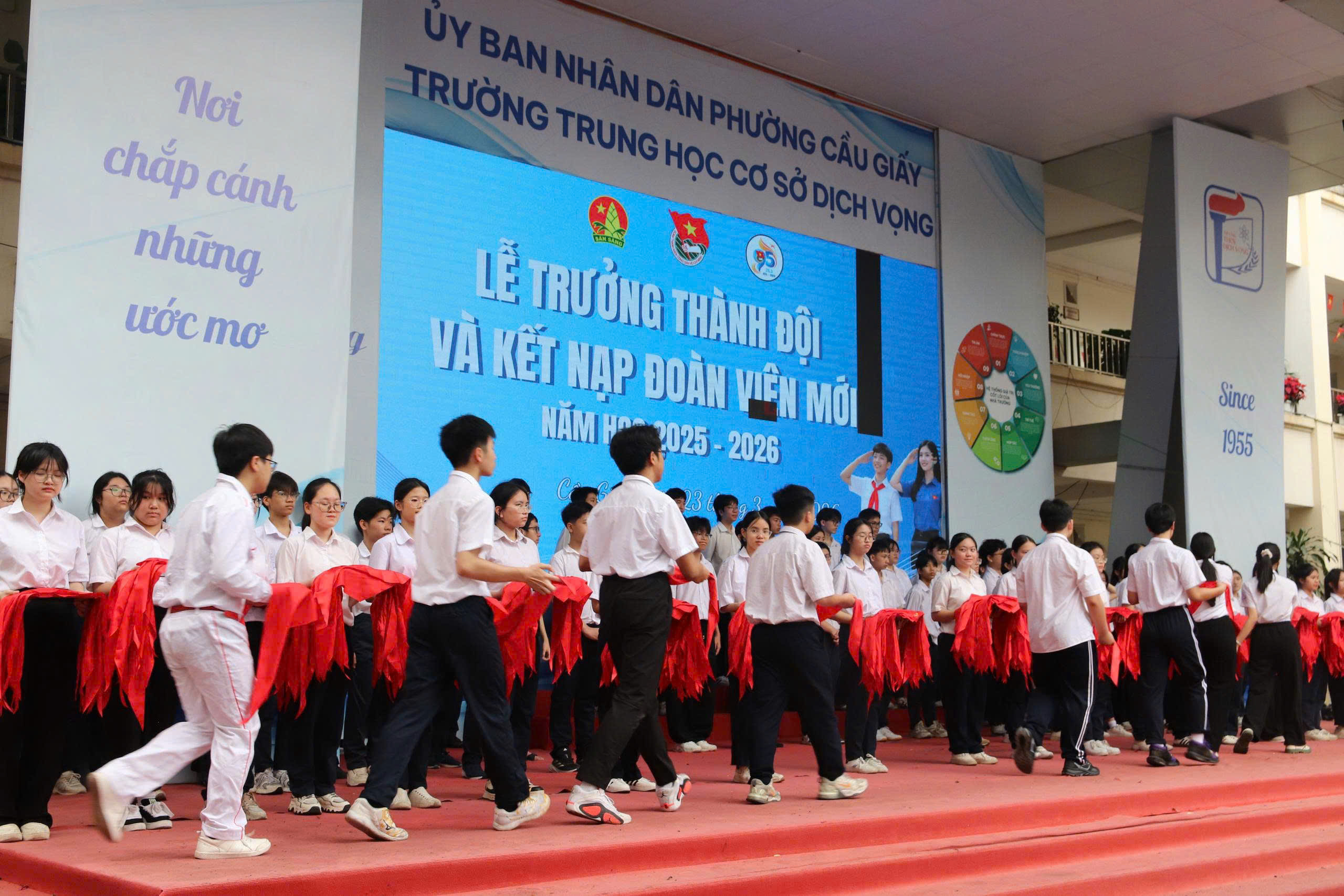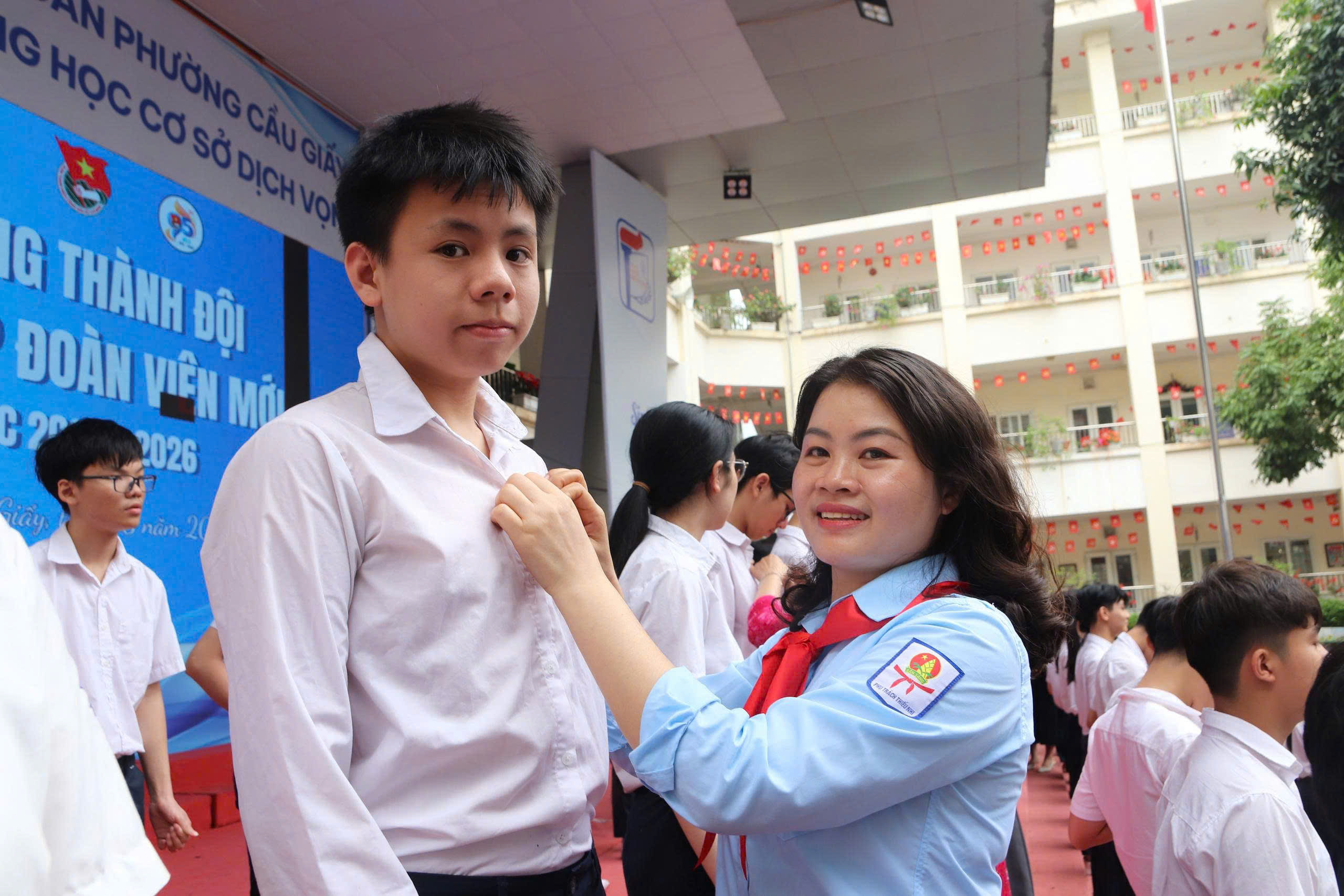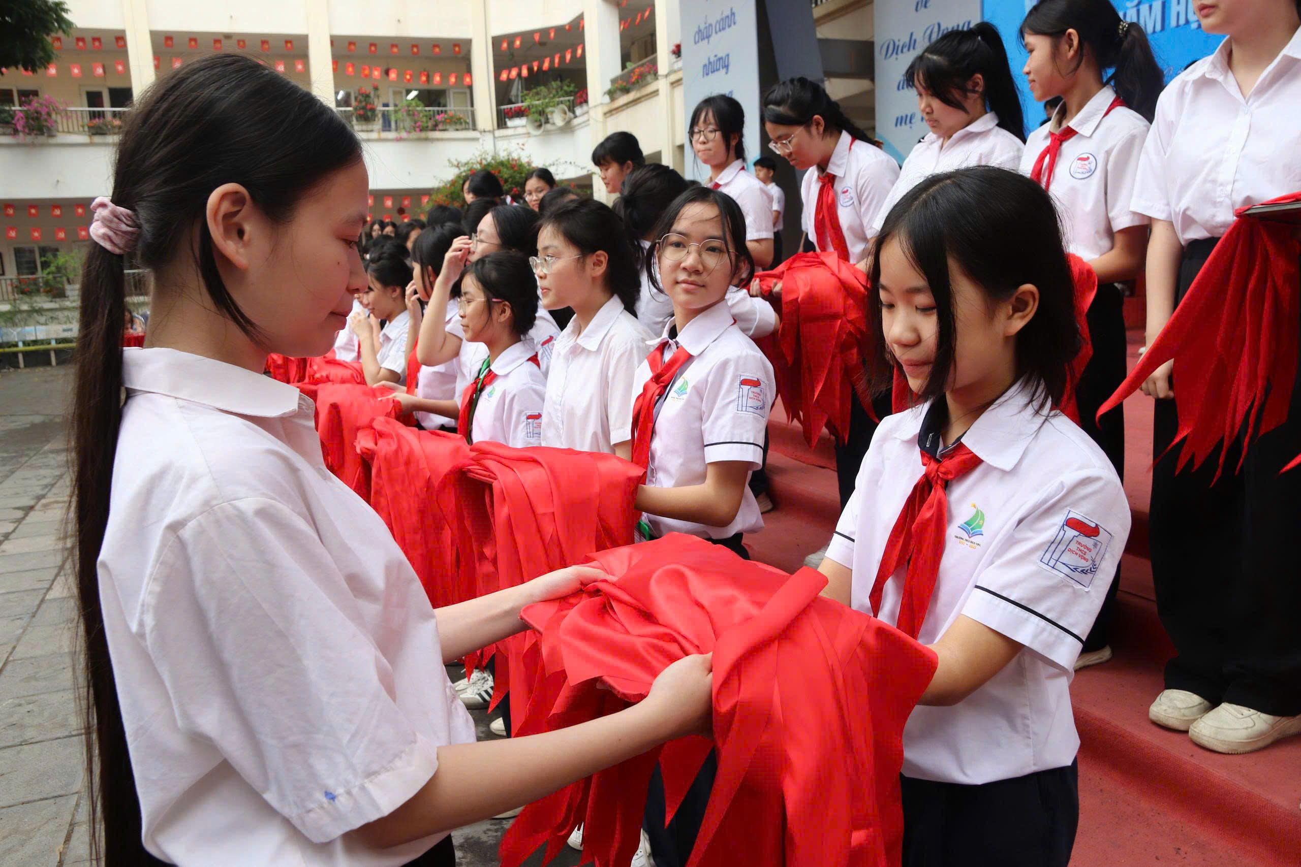 Một trong những khoảnh khắc xúc động của ngày hội là hoạt động trao tặng khăn quàng đỏ với sự tham gia của 511 em đội viên trưởng thành khối 9, trao lại khăn quàng cho các em đội viên khối 6, 7. Hình ảnh trao gửi chiếc khăn quàng – biểu tượng thiêng liêng của Đội – không chỉ đánh dấu sự trưởng thành của các anh chị lớp lớn mà còn thể hiện sự tiếp nối truyền thống, gửi gắm niềm tin và trách nhiệm cho thế hệ kế tiếp.