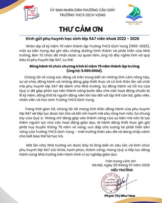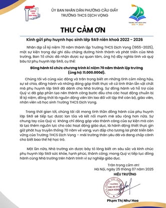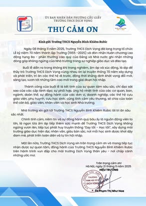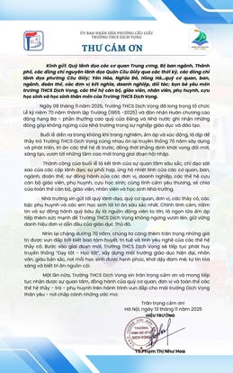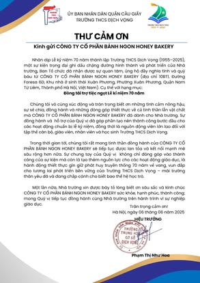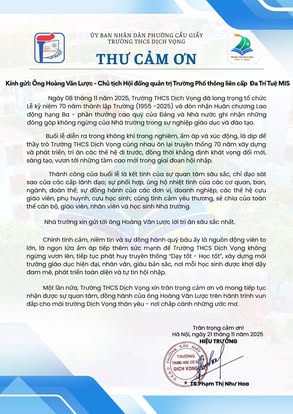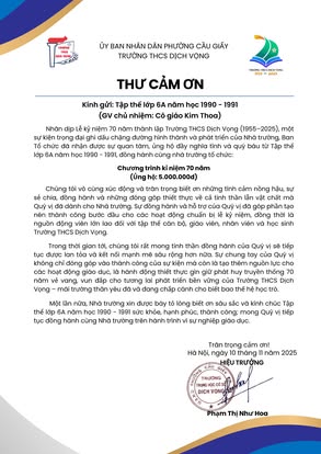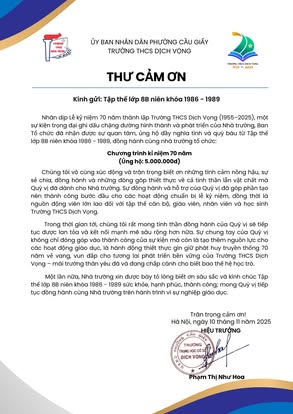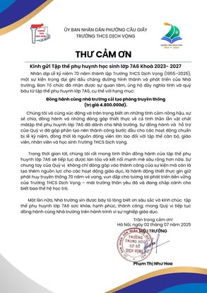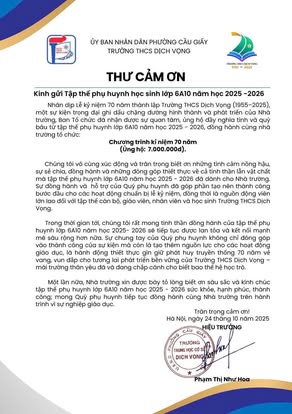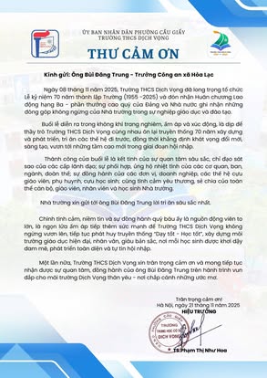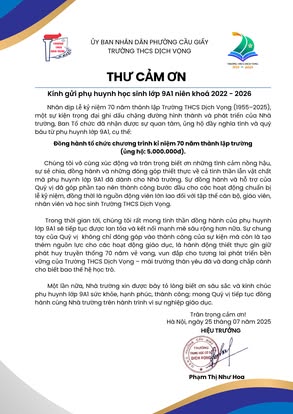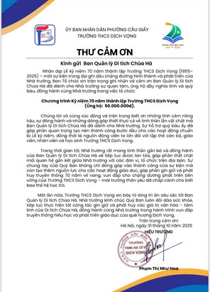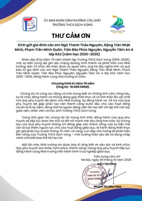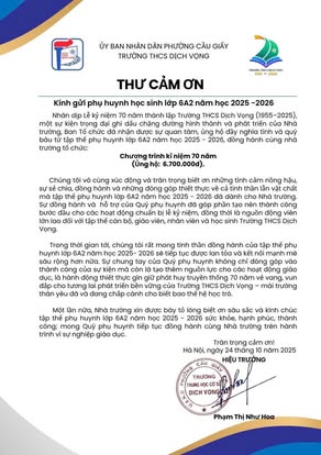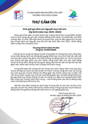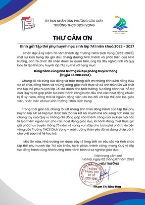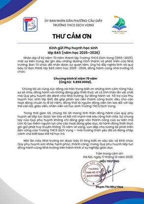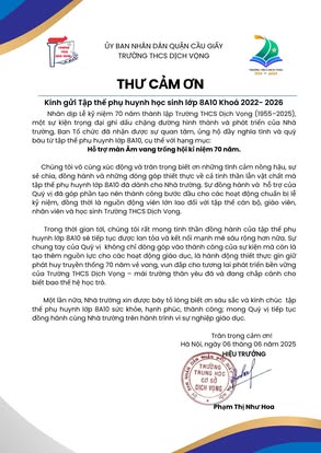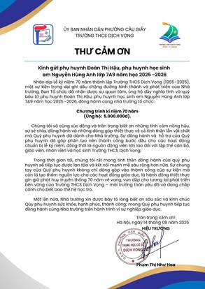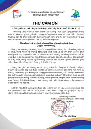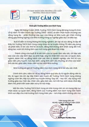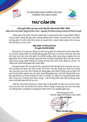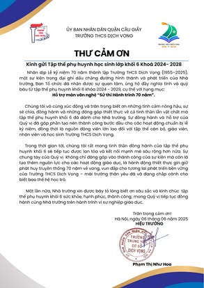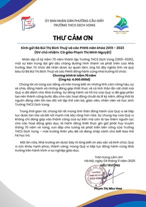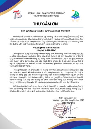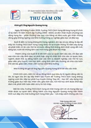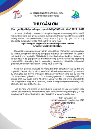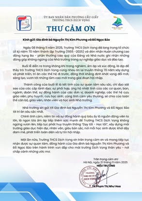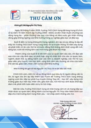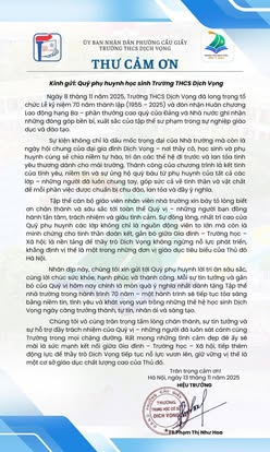 THCS DỊCH VỌNG TRÂN TRỌNG CẢM ƠN NHÂN DỊP KỶ NIỆM 70 NĂM NGÀY THÀNH LẬP TRƯỜNG