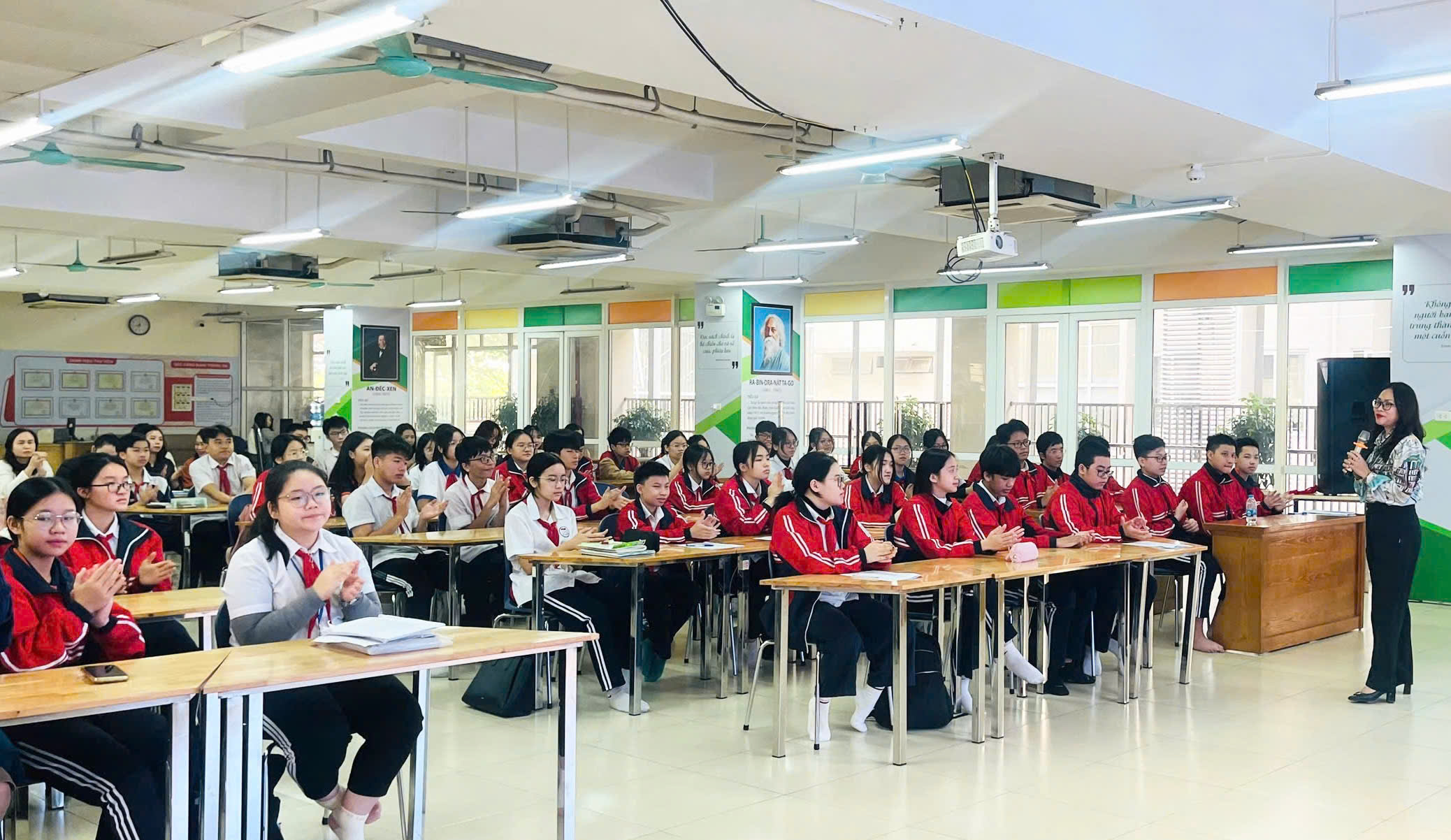 Đại diện cho 69 học sinh tham gia đội tuyển, em Hoàng Hiểu Khánh – học sinh lớp 9A11, đội tuyển môn Ngữ văn – đã xúc động bày tỏ lòng biết ơn sâu sắc tới Ban Giám hiệu cùng các thầy cô giáo. Em chia sẻ rằng chính sự yêu thương, quan tâm và đồng hành của thầy cô là động lực để các bạn vững bước trên con đường chinh phục tri thức. Hiểu Khánh cũng thay mặt các bạn thể hiện quyết tâm sẽ nỗ lực hết mình, kiên trì đến giây phút cuối cùng để mang về những kết quả xứng đáng với niềm tin mà thầy cô đã gửi gắm.