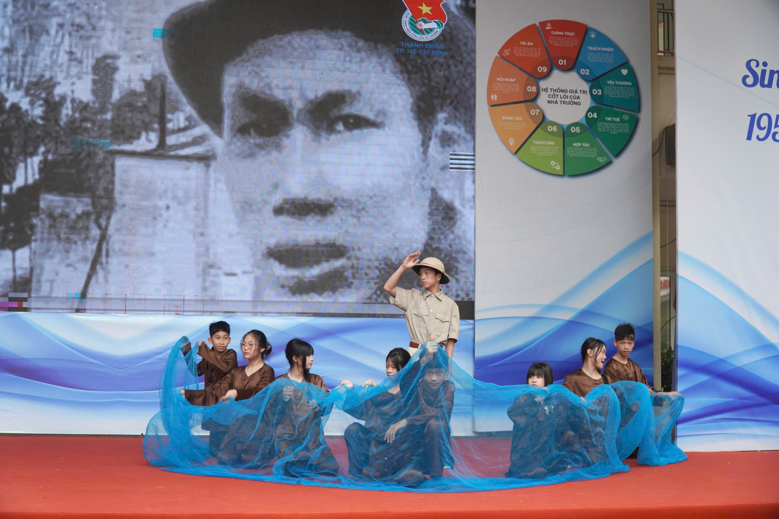 🩵 Điểm nhấn của ngày hội chính là phần sân khấu hóa vô cùng ấn tượng đến từ các học sinh lớp 6A1 và 6A3. Thông qua diễn xuất tự nhiên và đầy cảm xúc, các em đã giới thiệu đến thầy cô và bạn bè bộ tiểu thuyết lịch sử "Nước non vạn dặm" của nhà văn Nguyễn Thế Kỷ. Tác phẩm đã tái hiện chân thực hình ảnh Chủ tịch Hồ Chí Minh trong hành trình tìm đường cứu nước, giúp người xem hiểu thêm về "hành trình vạn dặm" gian khổ nhưng vinh quang của Bác.