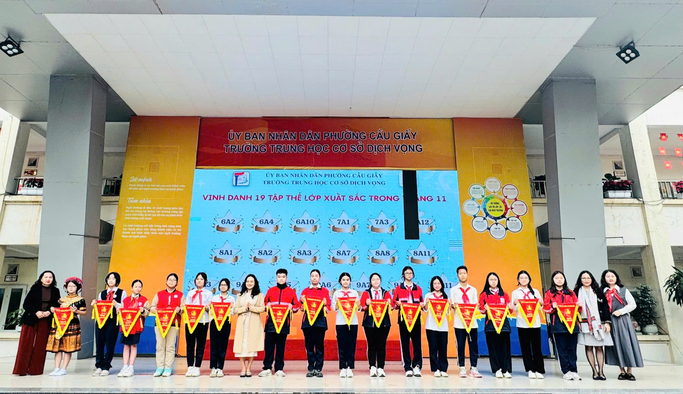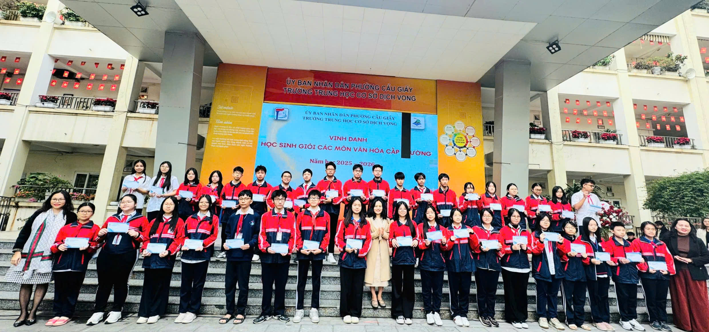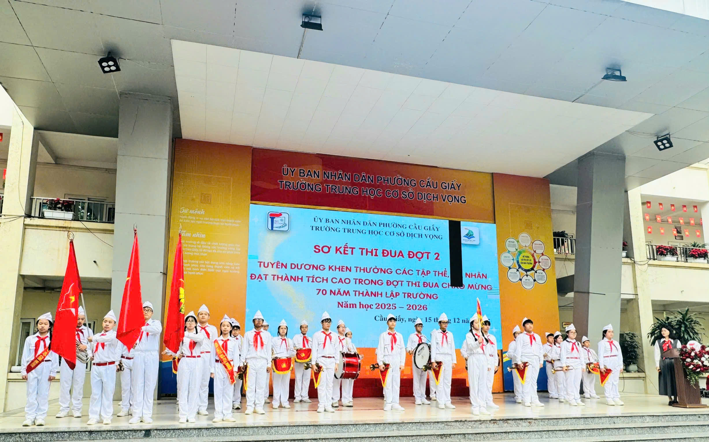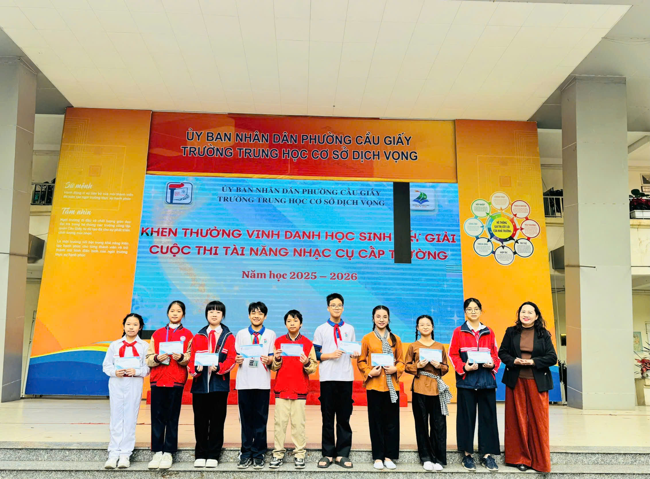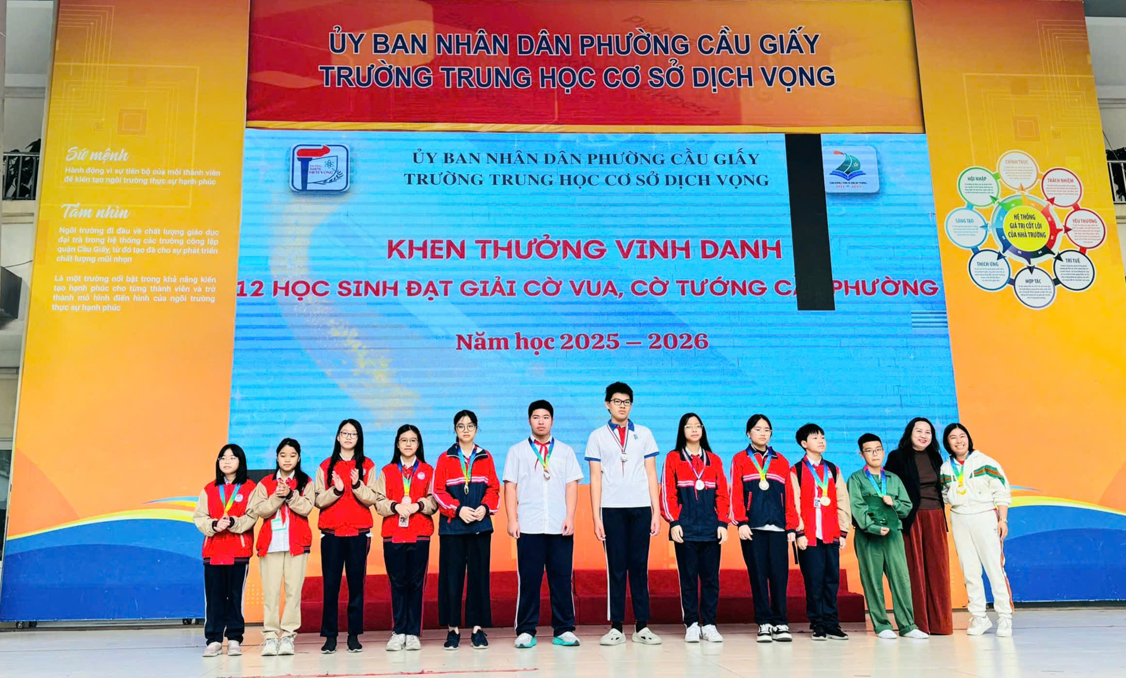📅 Ngày 15/12/2025, Trường THCS Dịch Vọng đã long trọng tổ chức Lễ khen thưởng vinh danh tập thể lớp, học sinh có thành tích trong thi đua đợt 2 năm học 2025 – 2026 nhằm biểu dương, tôn vinh các tập thể và cá nhân học sinh đạt thành tích xuất sắc trong các lĩnh vực văn hóa, thể dục thể thao, nghệ thuật và hoạt động phong trào. Đây là hoạt động ý nghĩa, góp phần động viên, khích lệ tinh thần học tập, rèn luyện của học sinh, đồng thời khẳng định hiệu quả của công tác giáo dục toàn diện trong năm học 2025 – 2026.