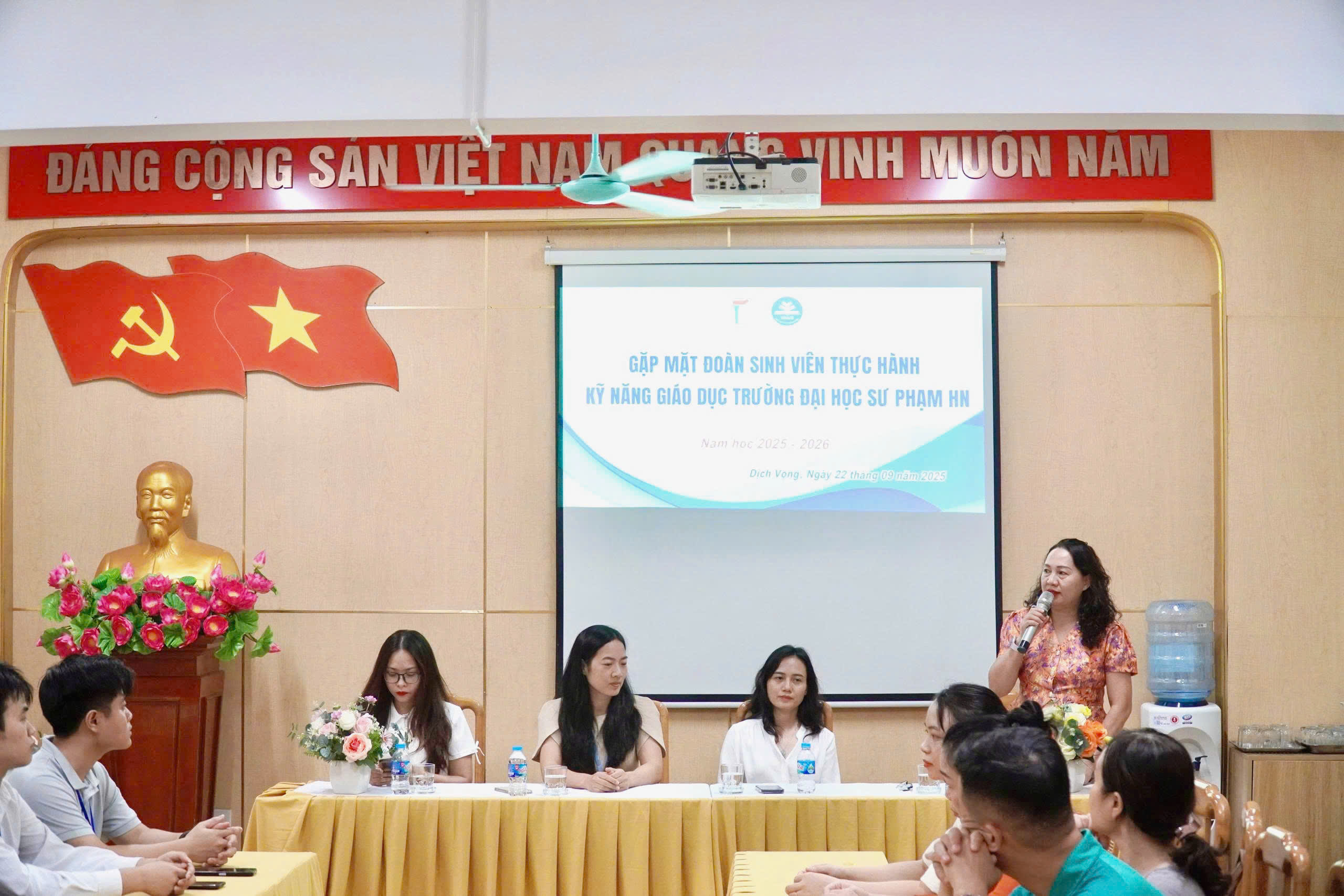 💥Đại diện Ban Giám hiệu nhà trường, cô Nguyễn Thị Hồng Minh- Phó Hiệu trưởng bày tỏ sự vui mừng,chào đón đoàn giáo sinh kiến tập, cô cũng gửi lời chúc mừng, động viên các giáo sinh sẽ phát huy năng lực và tích lũy kinh nghiệm để có một kì kiến tập thành công.